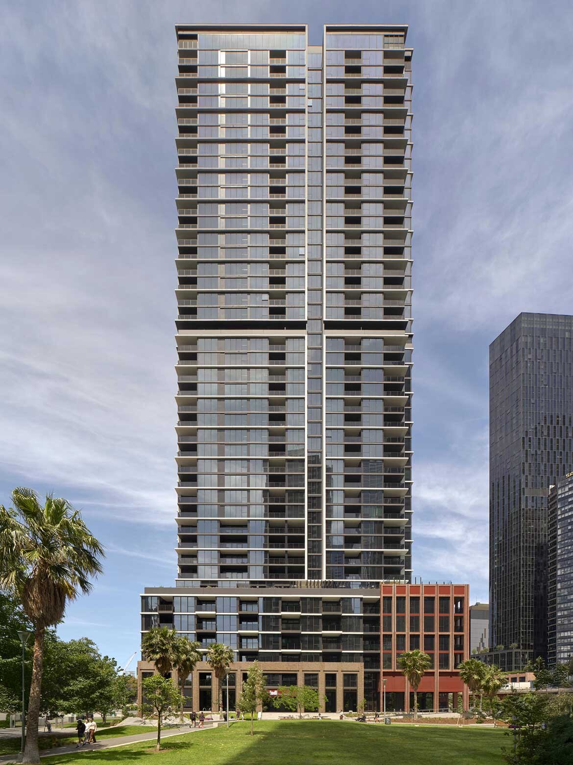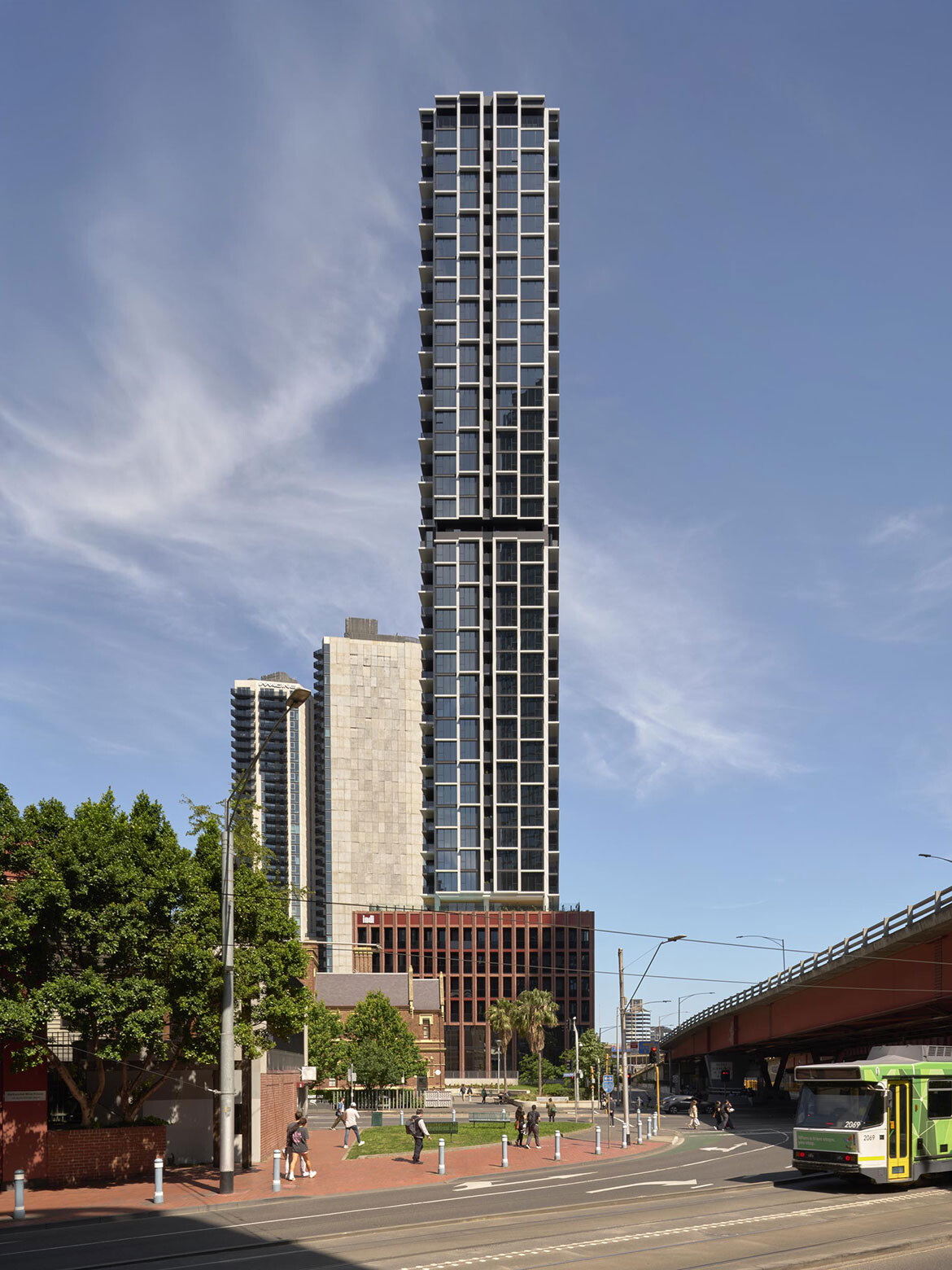 Rather than adopting the glass-led language that defines much of the precinct, DKO’s design responds directly to its context. The building draws on the red brick materiality of the former JH Boyd Girls’ School alongside the industrial character of surrounding infrastructure, including the Kings Way overpass. This approach positions the tower as both a counterpoint to nearby high-rise development and a continuation of the area’s material history.