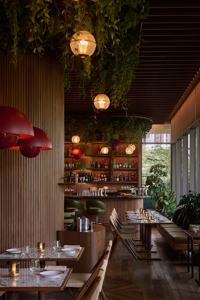 Conceived by Colin Seah of Ministry of Design, the multifaceted interior weaves a tactile story of biophilic materiality, mid-century modern vocabulary and elevated whimsy. The perimeter of the space is outlined by the juxtaposition of a transparent expanse of glazing and the hypnotic mural creeping along the walls with colourful intricacy, only to gently resolve into a defining gesture of timber panelling. Above, lush greenery cascades down in a generous, relaxed cadence, revealing pockets of soothing illumination, while the vibrant confidence of carefully crafted, custom pieces accentuates the space’s joyful nature.