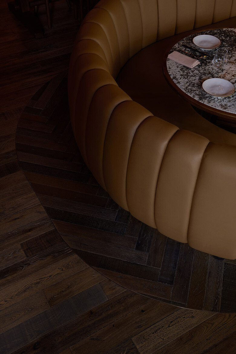 Using traditional techniques like hand-brushing, WOW meticulously crafted the hardwood to emphasise oak’s innate tactile beauty and achieve the genuine distressed look and feel. This careful process enabled the team to honour the distinct visual individuality of each board, accentuating its idiosyncrasies and imperfections to harmoniously underscore the authenticity of this decidedly contemporary interior. “Everything was tailored to the restaurant’s palette and lighting, so the floor doesn’t just sit there; it really helps shape the mood,” Mohammad says.