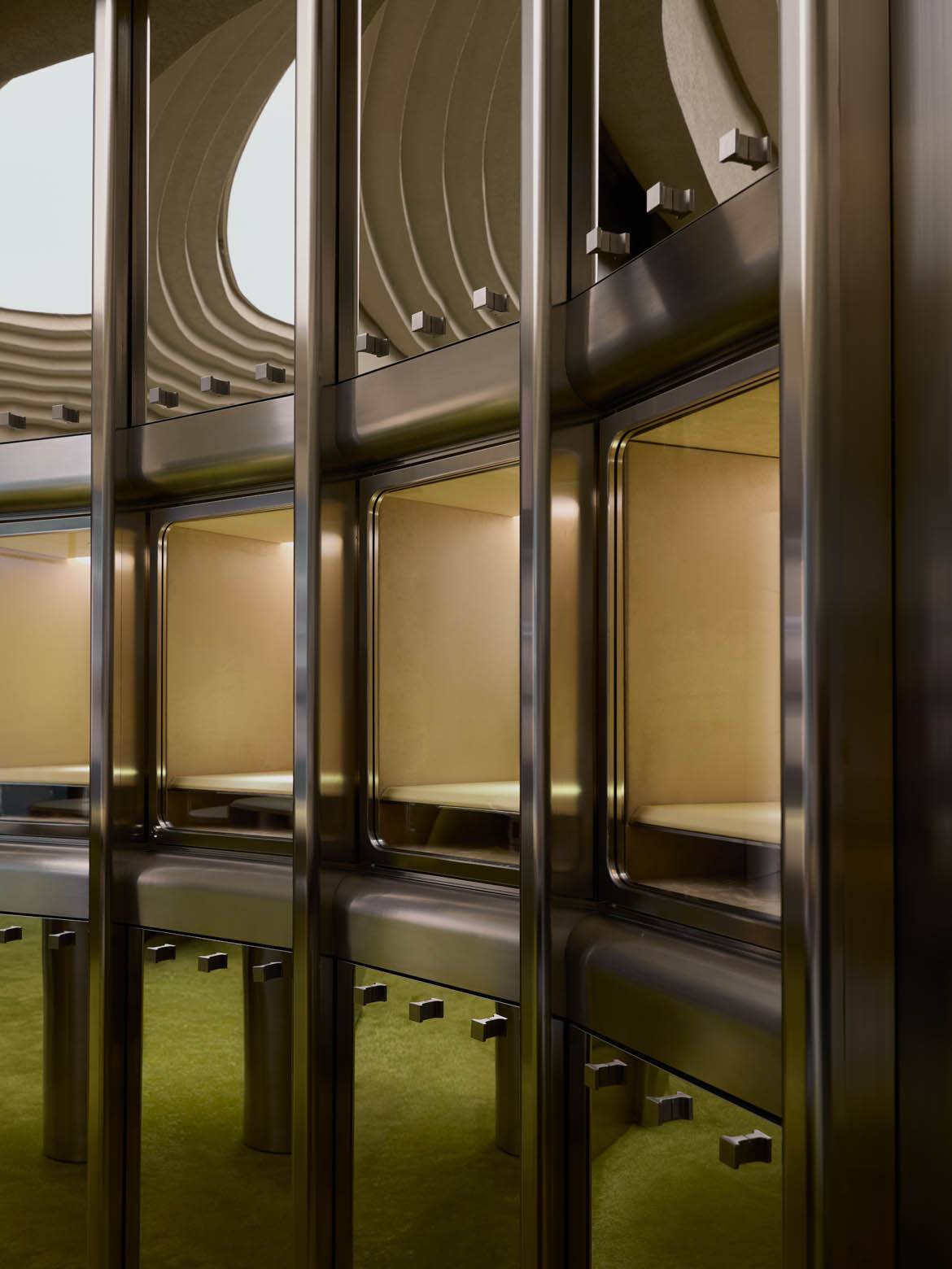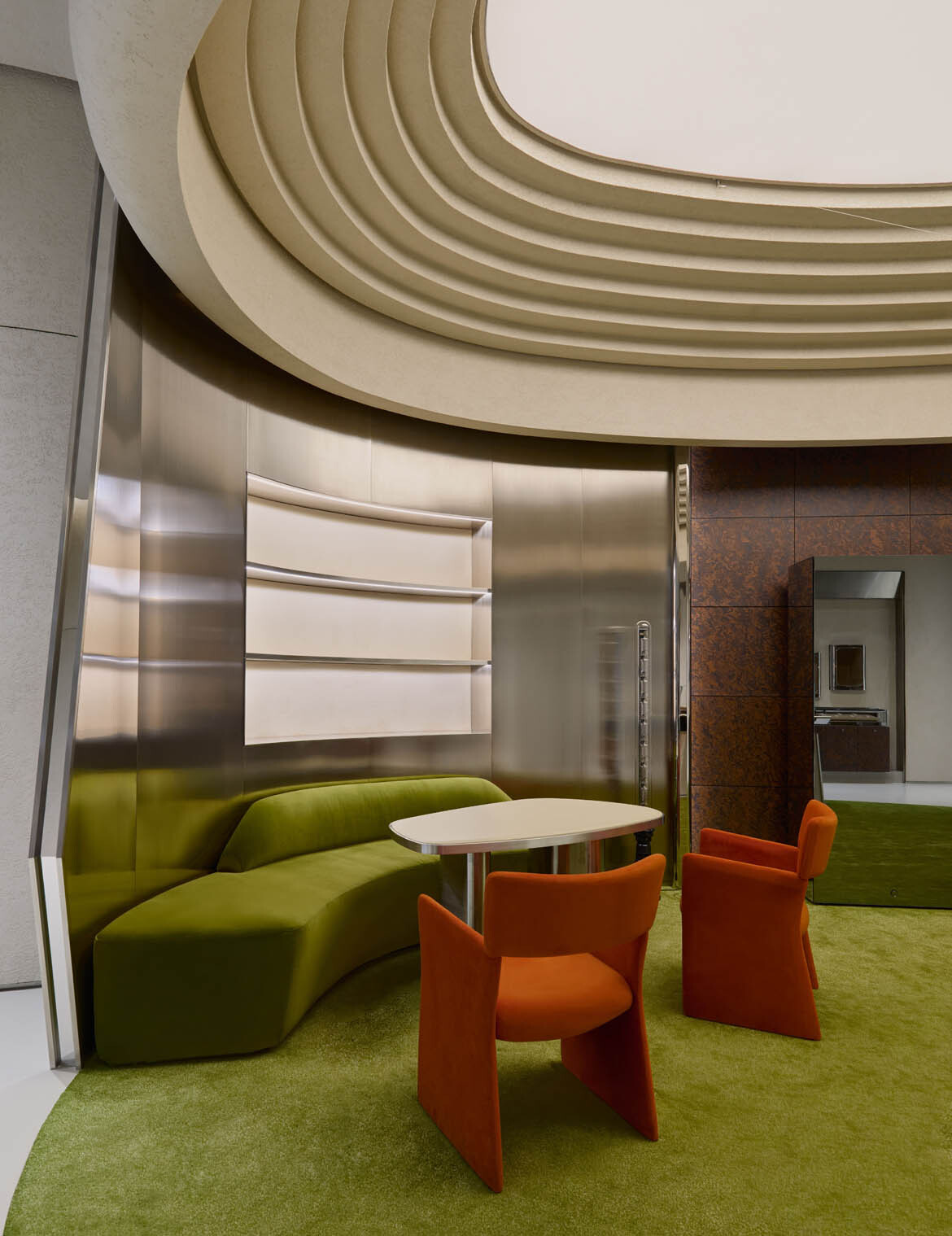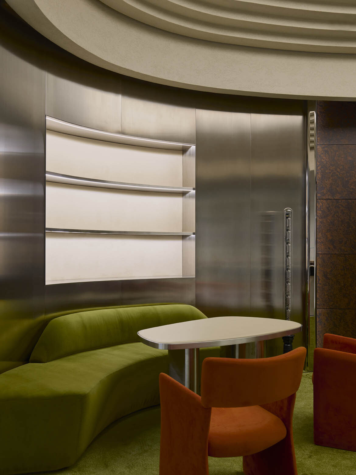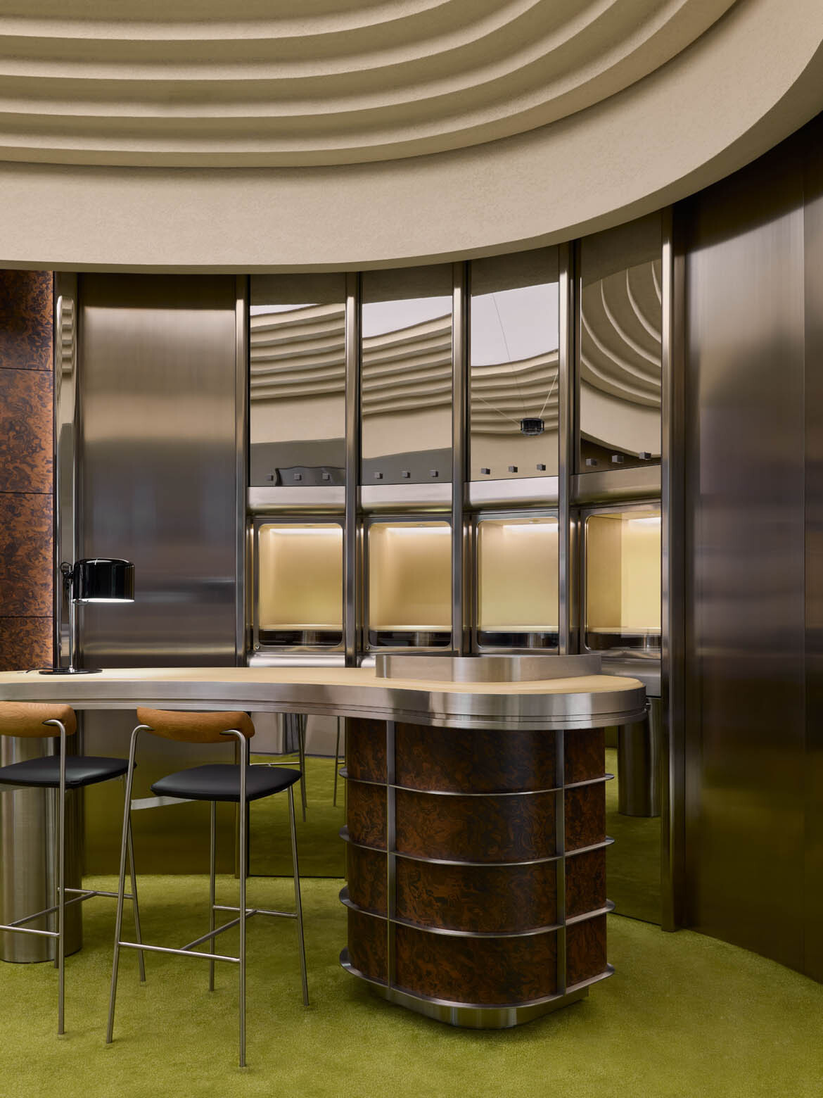At the heart of the boutique lies a striking stainless-steel-lined wall, seamlessly integrating built-in shelving, glass display showcases and a consultation lounge. These sweeping, organic forms serve as both a functional backdrop and a sculptural invitation, evoking curiosity and gently drawing patrons deeper into the collection of exquisite timepieces.