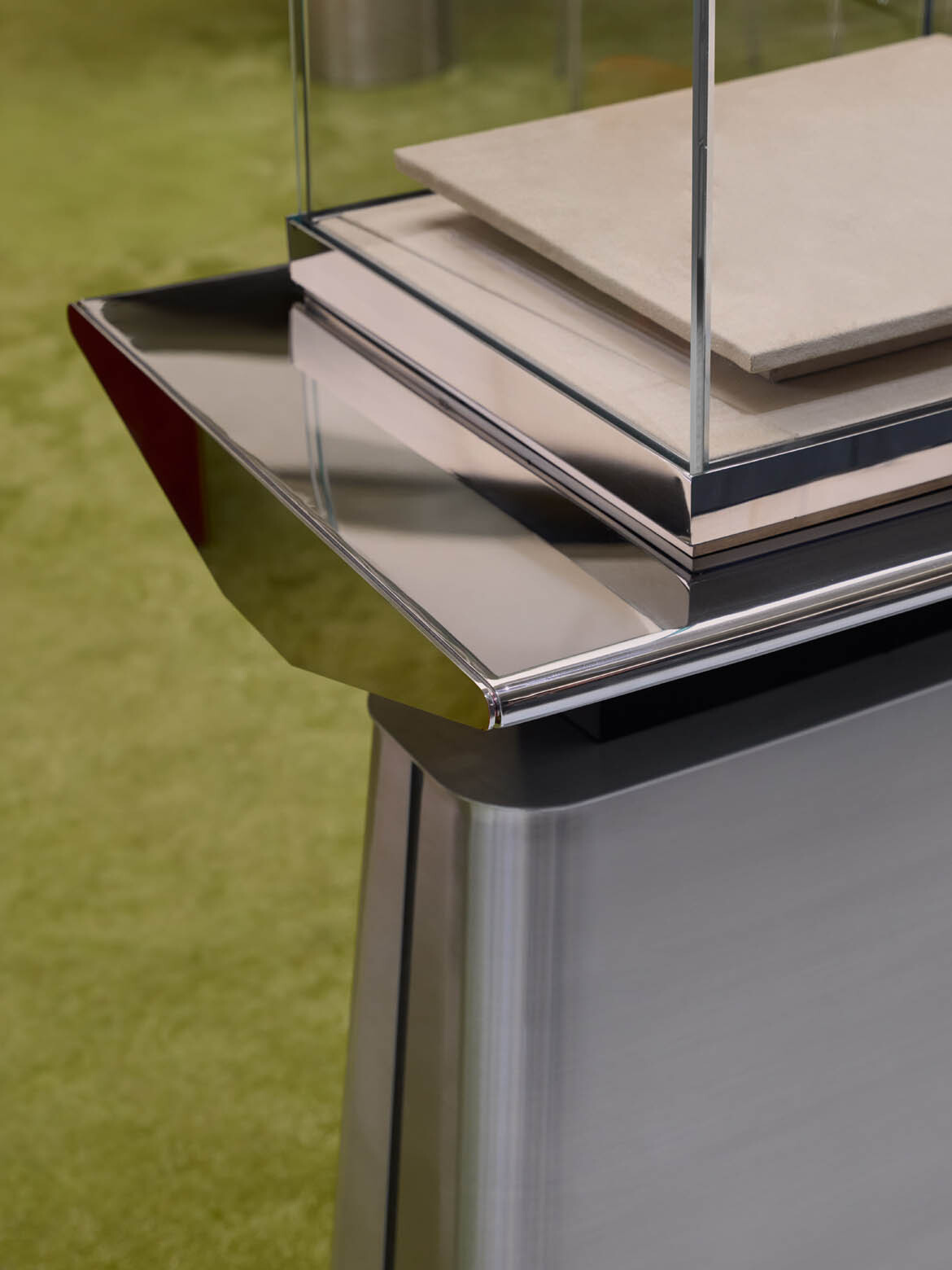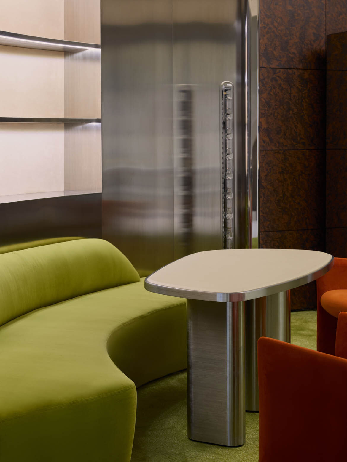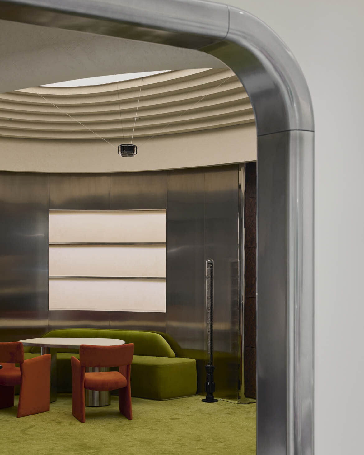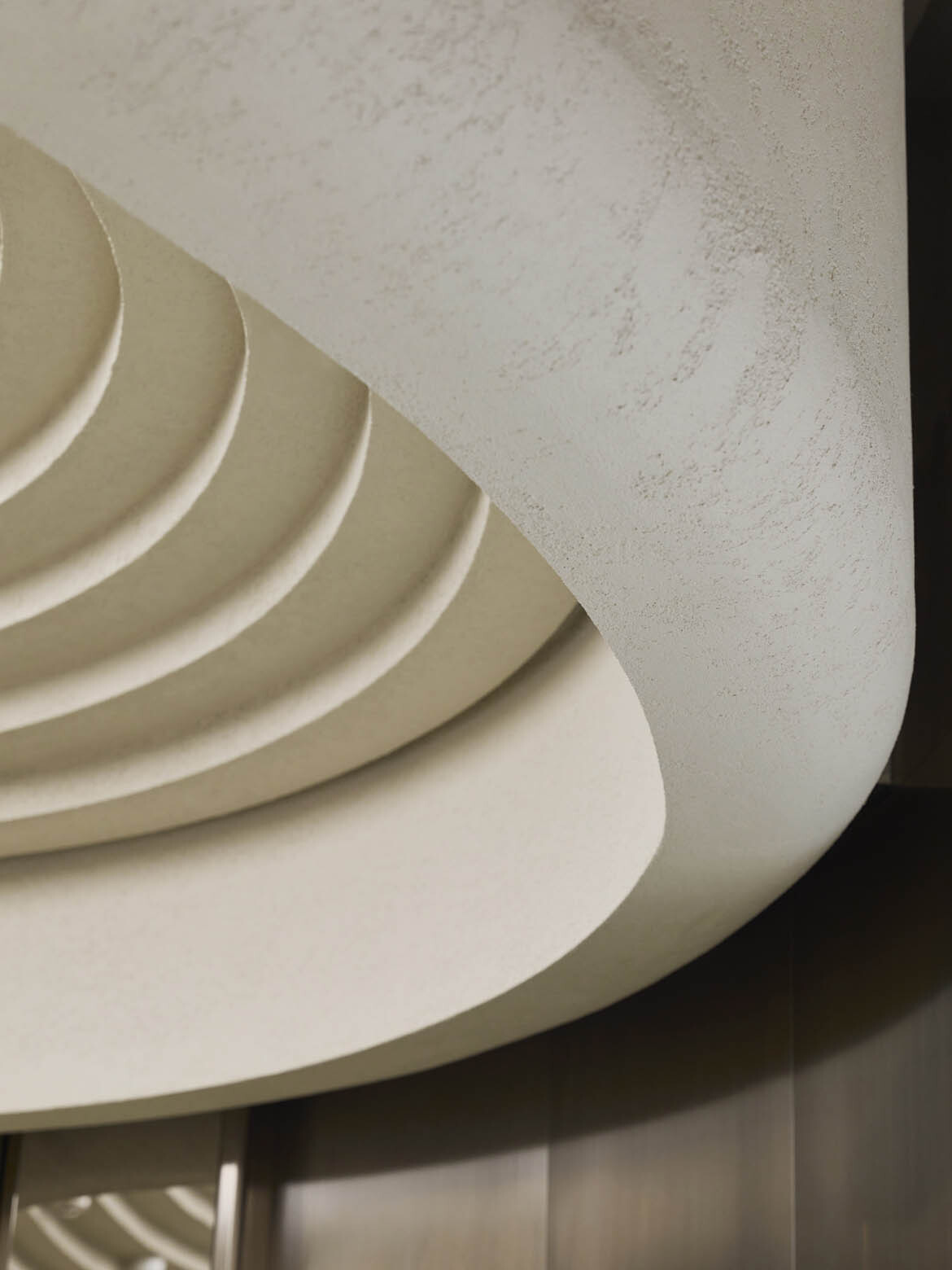 At the heart of the boutique lies a striking stainless-steel-lined wall, seamlessly integrating built-in shelving, glass display showcases and a consultation lounge. These sweeping, organic forms serve as both a functional backdrop and a sculptural invitation, evoking curiosity and gently drawing patrons deeper into the collection of exquisite timepieces.