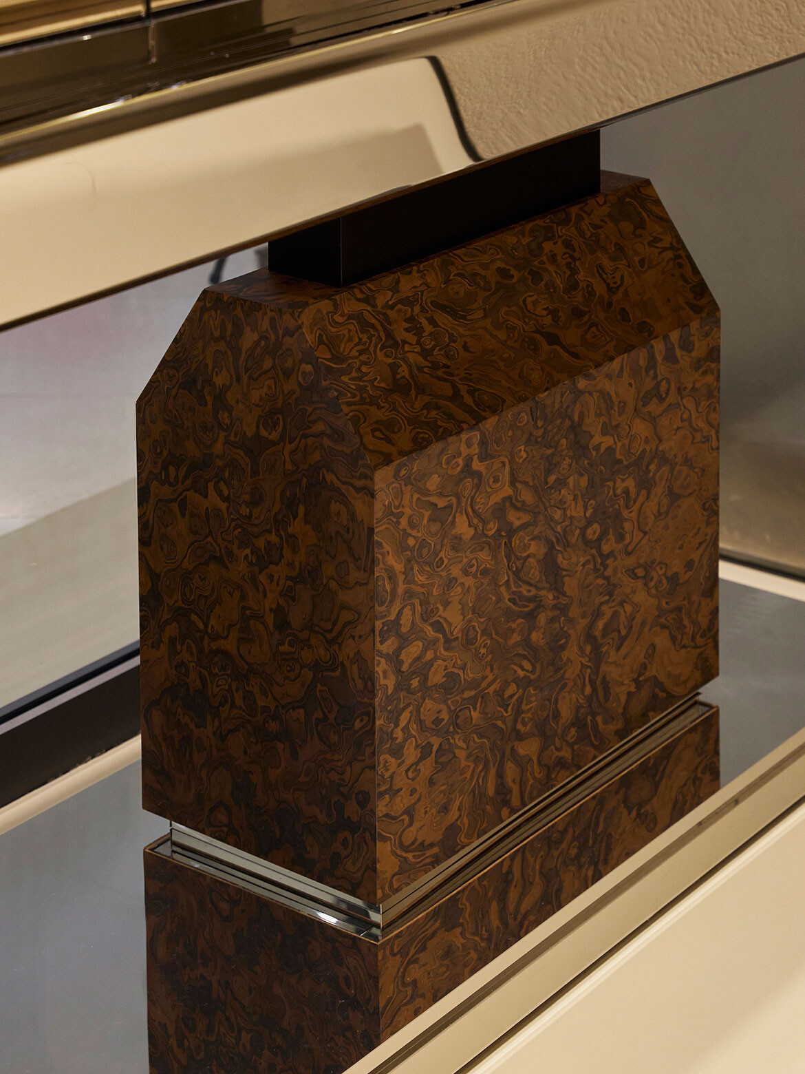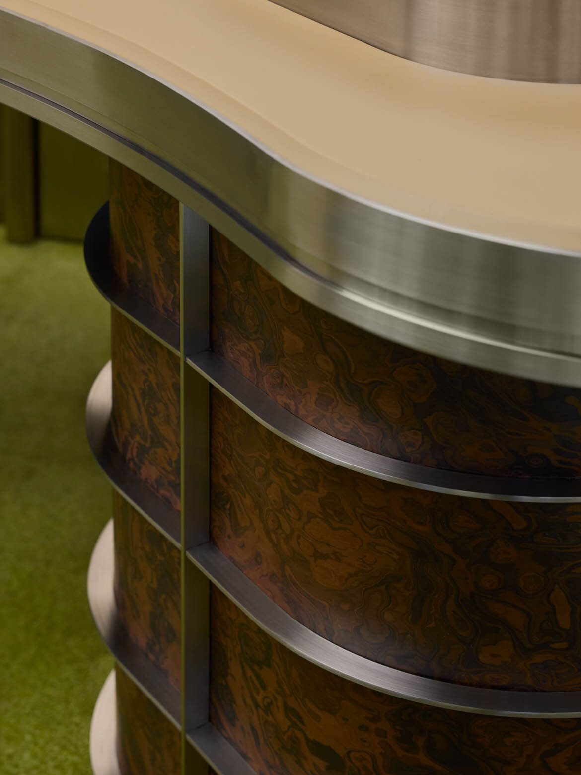 Anchoring the centre of the space is a series of bespoke display islands and a consultation bar, crafted from rich Alpi burl wood and polished metal. Together they form a defining focal point that balances material richness with precision. Every detail within the store has been meticulously considered to reflect the intricacy, discipline and distinct geometry of high watchmaking.