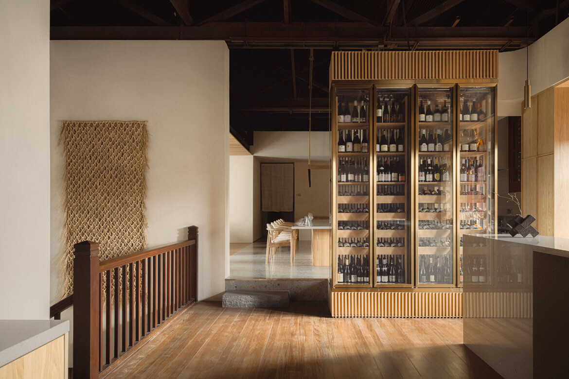 Perhaps one of the most poignant embodiments of the restaurant’s narrative of craft, tradition, and adaptive reuse is a tapestry at the staircase. It is designed by Japanese design group Straft, who creates modern pieces from rice straw – a material originally used to create agricultural by-products.