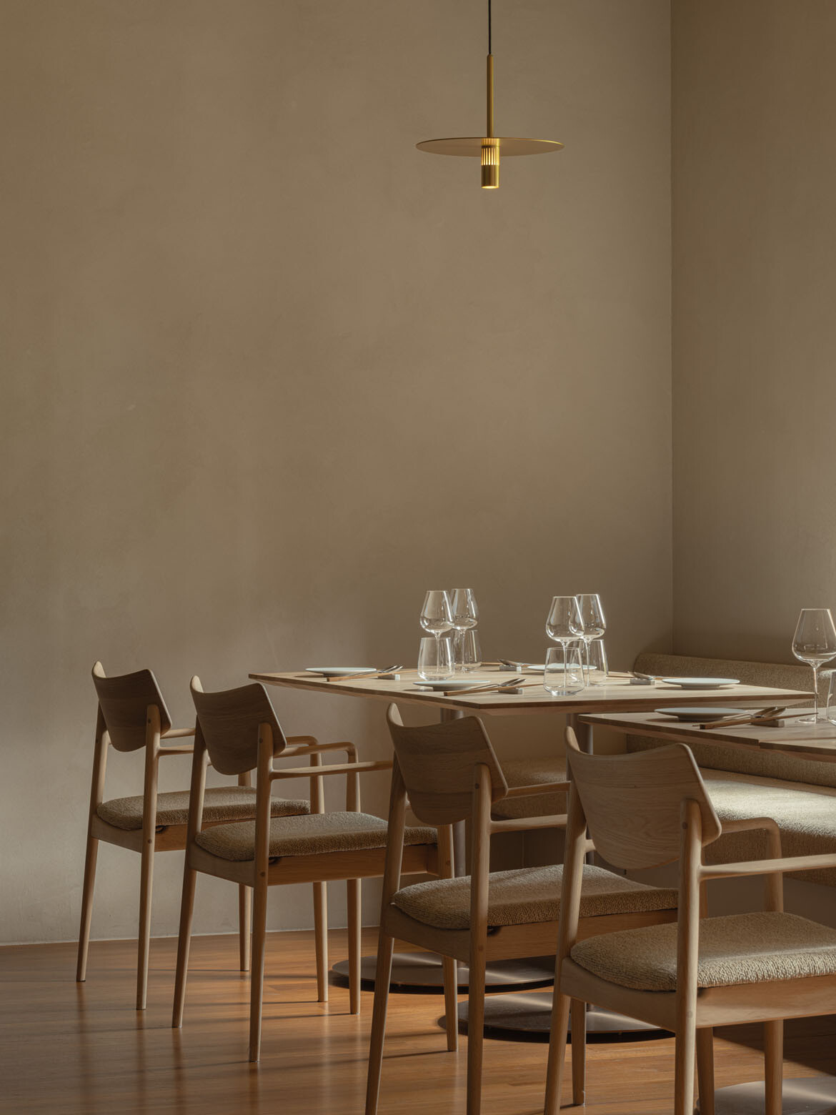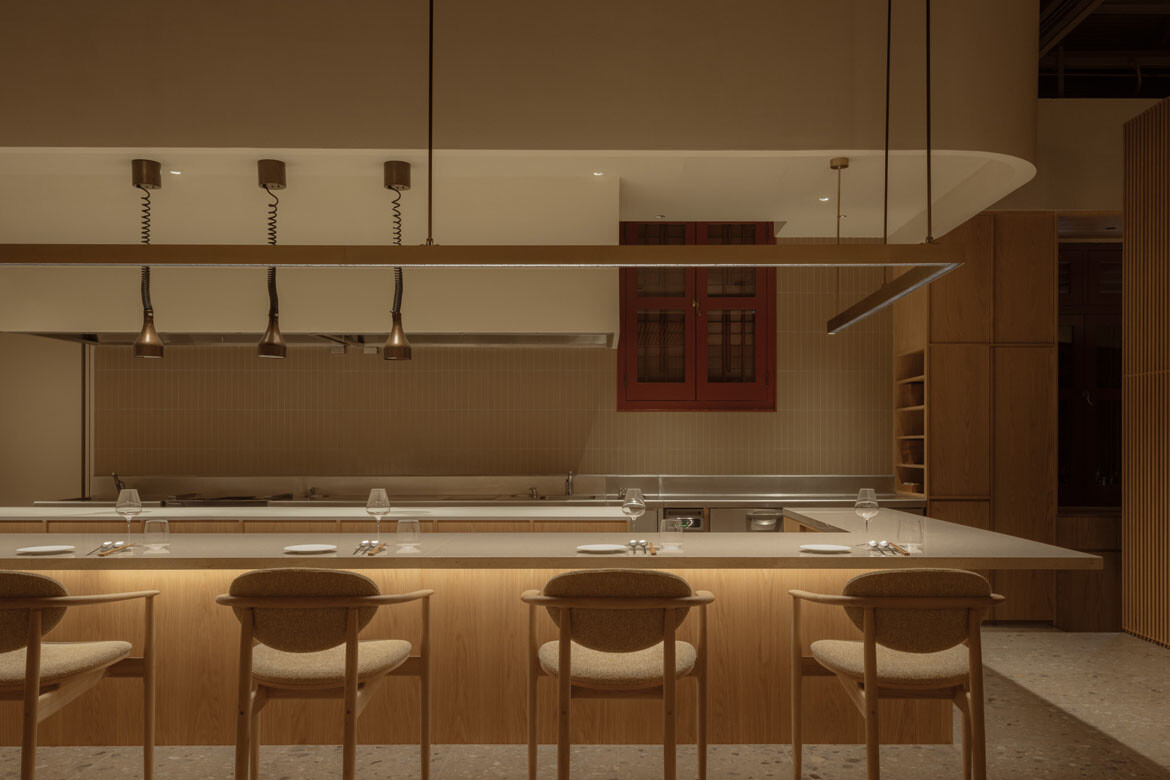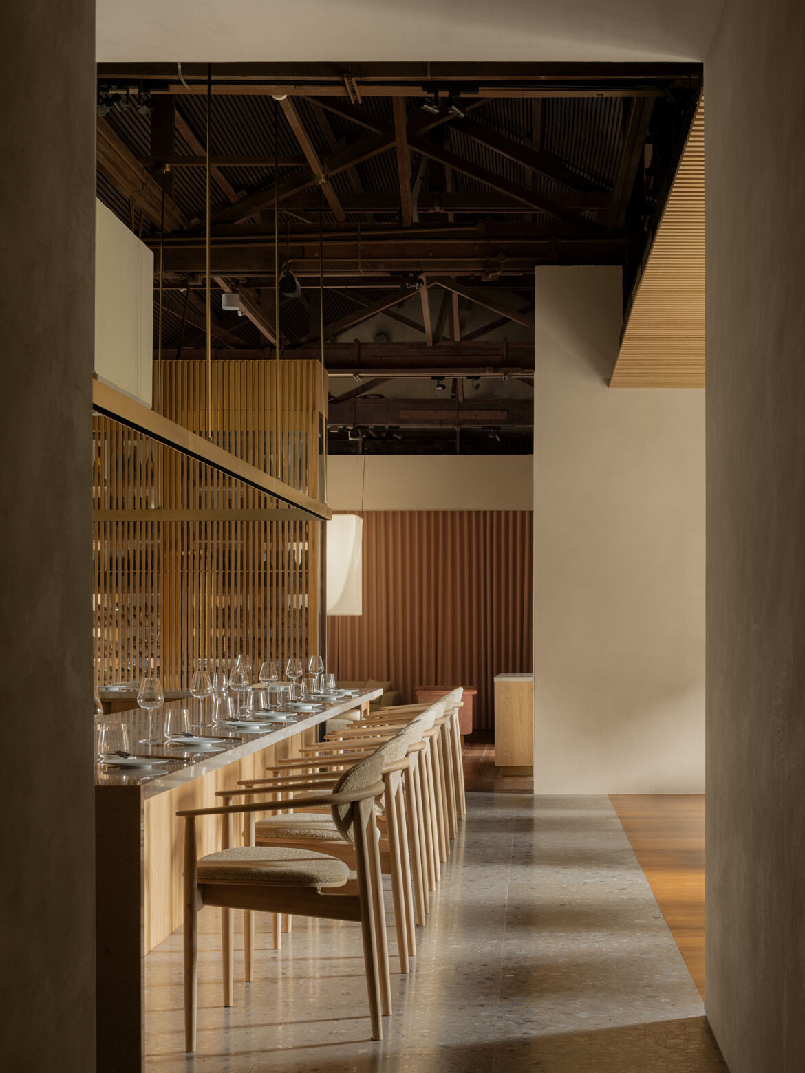 The bar counter is the central feature that distributes into two zones – the dining area on the left, and the lounge and two private dining rooms on the right. The latter, elevated a step up, is floored with terrazzo, while a brighter lighting scheme with brass-finished disc pendant lamps and elongated pendant lights above the counter seats “draw attention to the activity of the show kitchen and establish a lively focal point upon arrival,” adds Ashizawa.