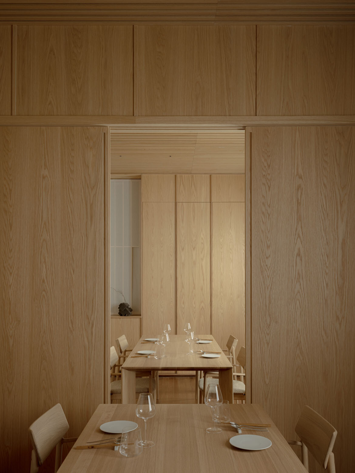 The restaurant’s story is expressed at the start and end of each restaurant visit, with custom handles on the solid wood entrance door designed to mimic reed stalks. Ashizawa concludes: “Together with the projection of reeds on the ground floor wall, these details extend the concept from arrival through to the dining space above.”