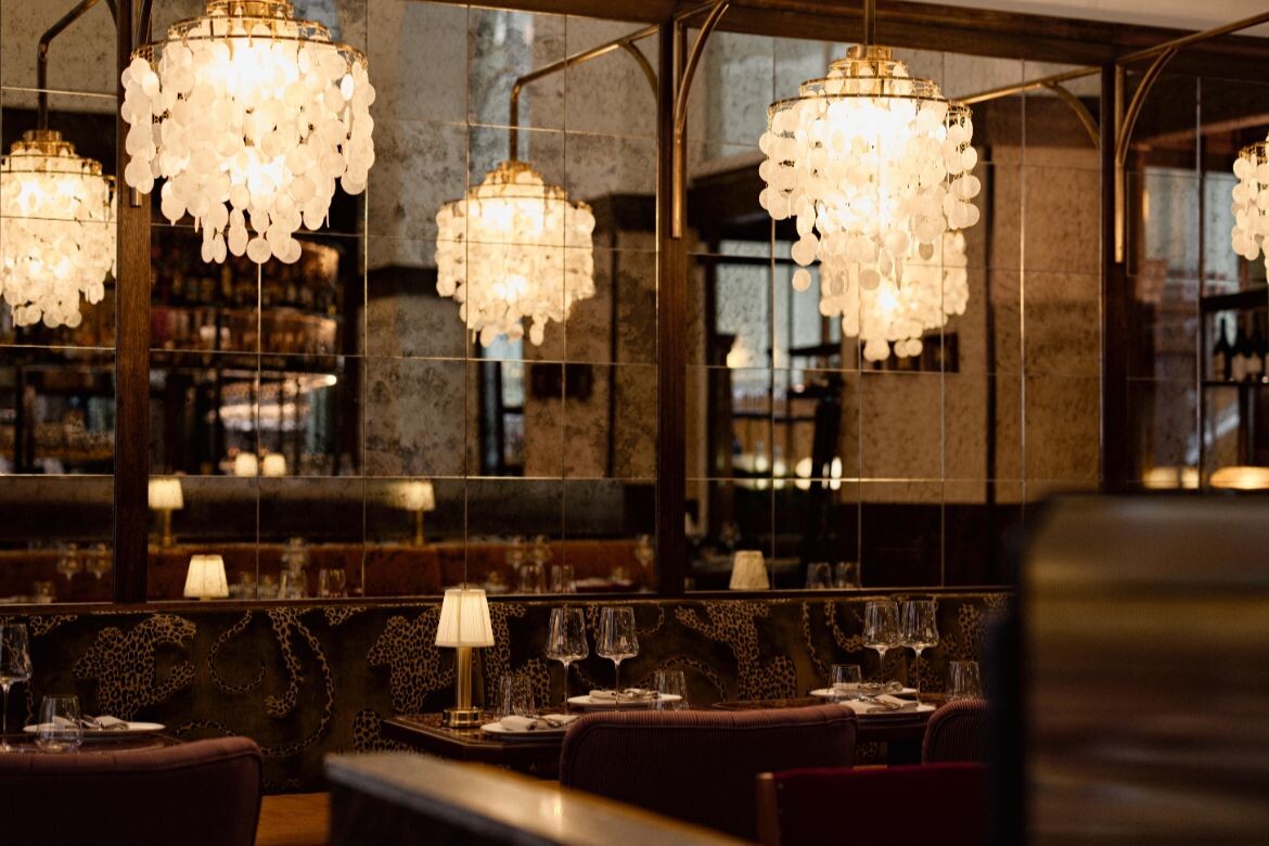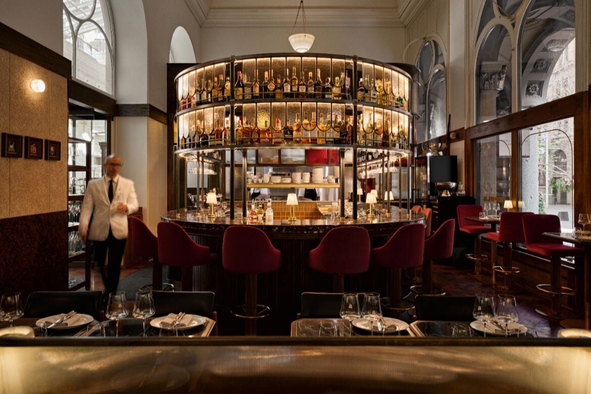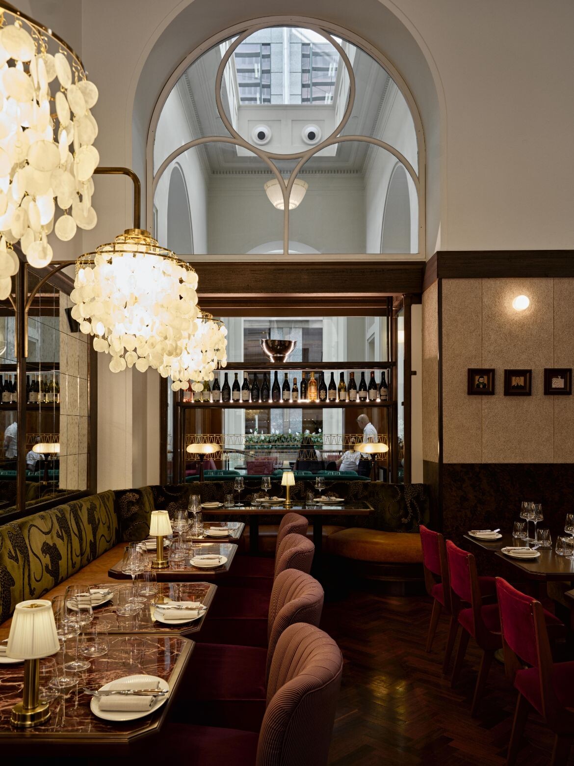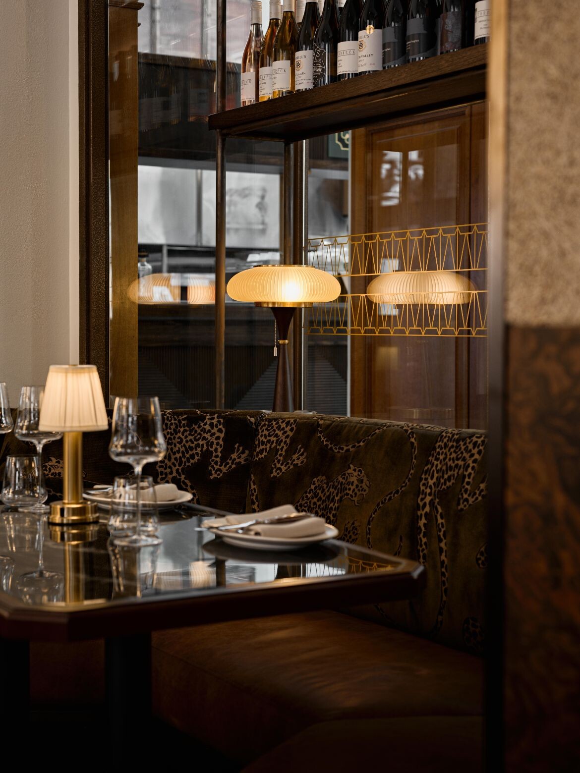 Lighting further enhances this sense of considered luxury. Natural light floods through the floor-to-ceiling windows from Martin Place, while the internal hotel lobby provides illumination from the opposite side. “The building provided the perfect lighting environment,” Krelle notes. Warm light from elegant chandeliers reflects beautifully in the gridded antique mirror lining the back wall, while small table lamps provide perfect reading light for menus.