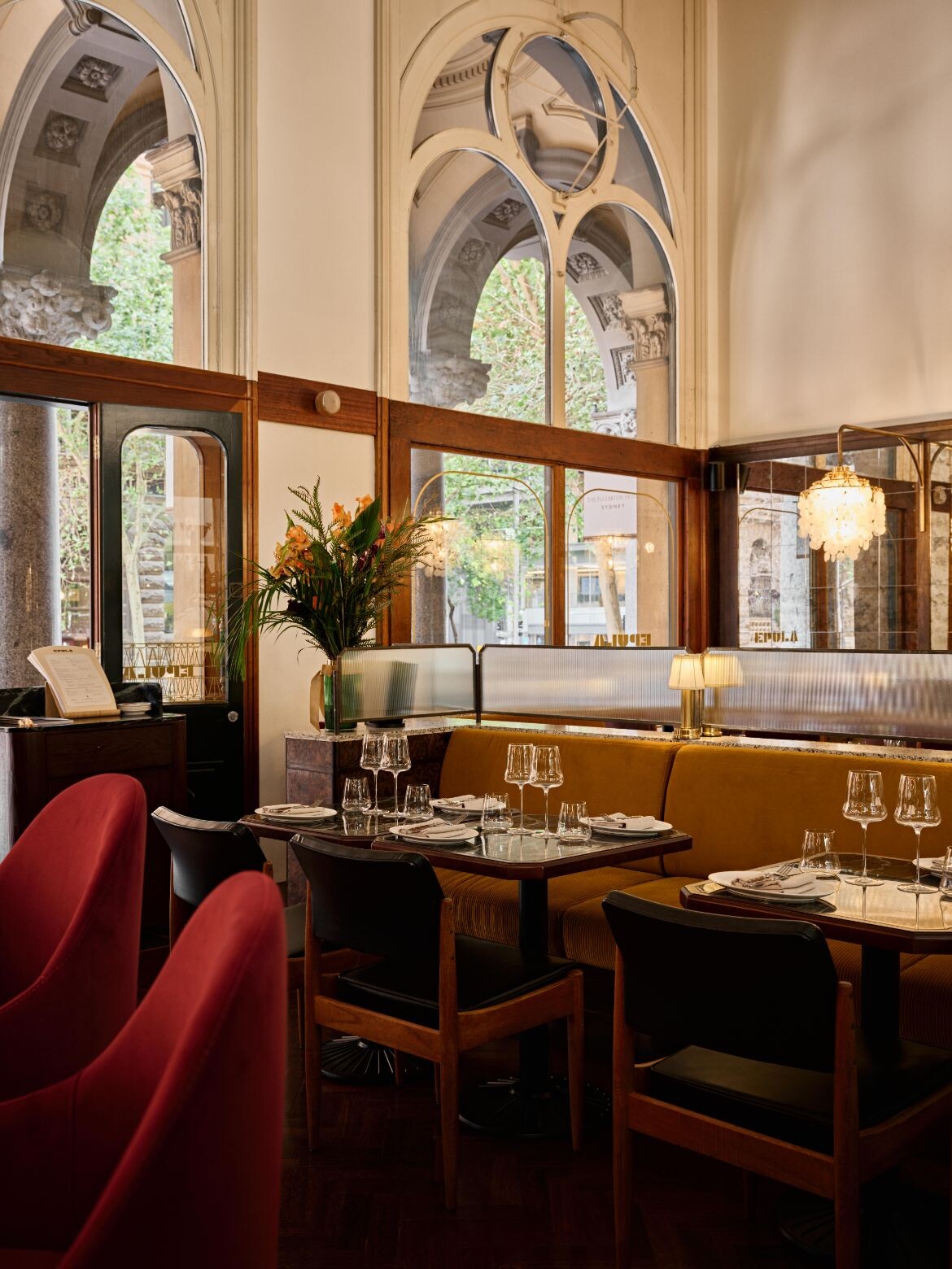What strikes most about Epula is how effortless it all feels. Krelle states: “In hospitality design, you have to hit markers of acoustics, lighting and mood.” There is a relaxed, welcoming energy – buzzing without being pretentious, quality without ostentation. The design speaks to Luchetti Krelle’s considered approach and the Tapavino Group’s broader sensibility while allowing the GPO Building’s natural opulence to shine. As Krelle reflects, the building’s great bones provided the foundation for layering elegant, luxe details: “Rich reds, caramel mustards, deep sumptuous greens – warmth alongside dark timbers and the velvet adds tactility and sheen.”