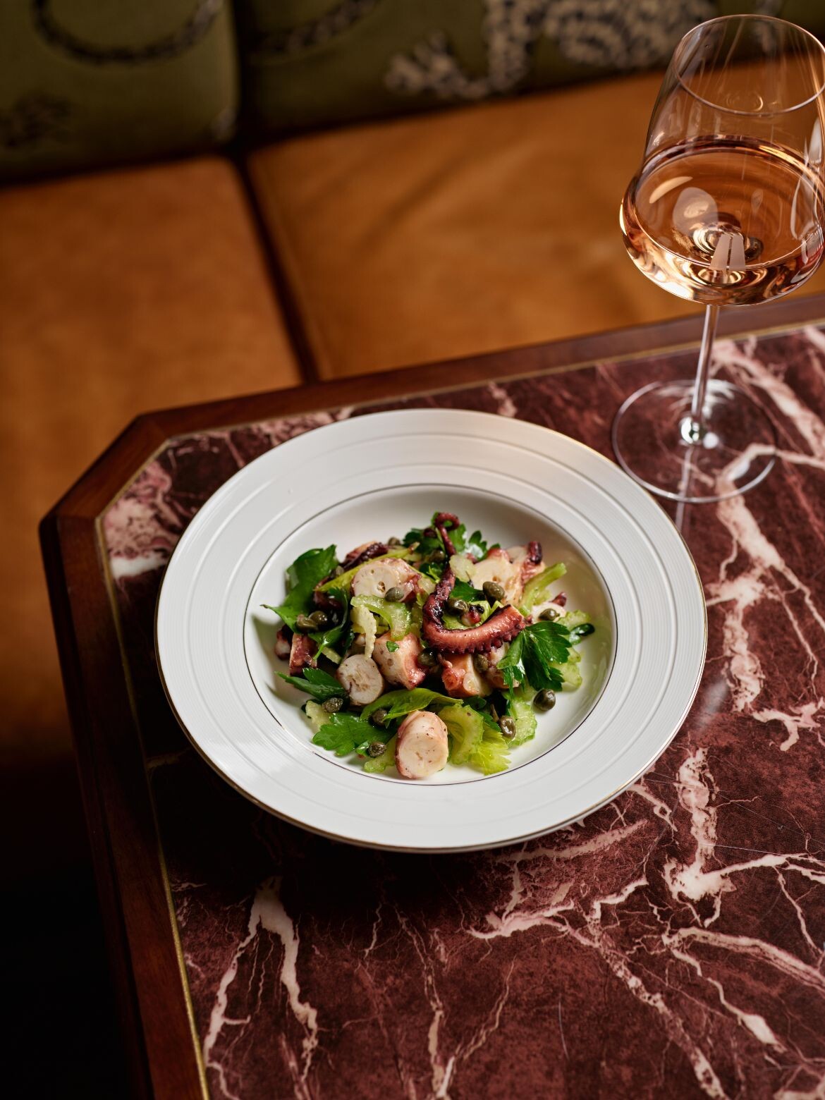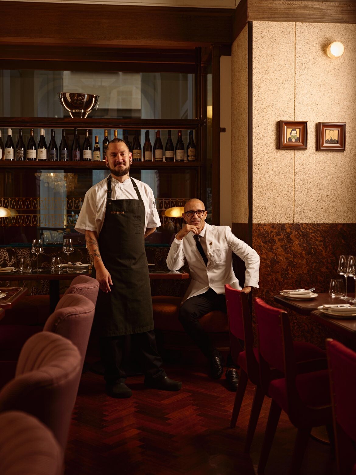 The restaurant unfolds across three distinct zones: outdoor dining along Martin Place’s historic colonnade, the main interior dining room and a spacious area that extends into the GPO itself, which can be accessed by the Fullerton Hotel lobby and serves guests with coffee and pastry at breakfast. Featuring deep green velvet banquette seating and bentwood chairs, the effect is intimate and elegant amidst the grand internal volume.