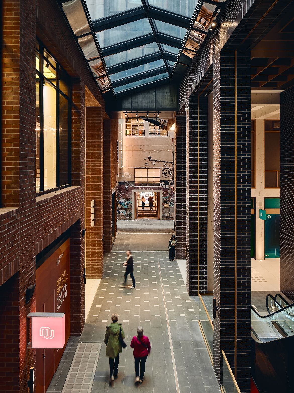 A new nine-metre-high arcade connects Bourke Street to Little Collins Street, conceived in the tradition of the neighbouring Royal and Block Arcades. Gold-tinted skylights run the length of the double-height space, their faceted shape referencing Diamond House’s gemstone past. The glass-covered east-west cross lane offers a finer-grained, tactile experience anchored by brickwork and bluestone.