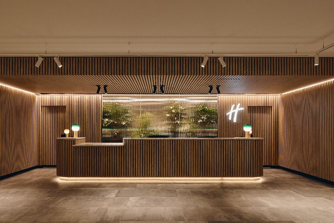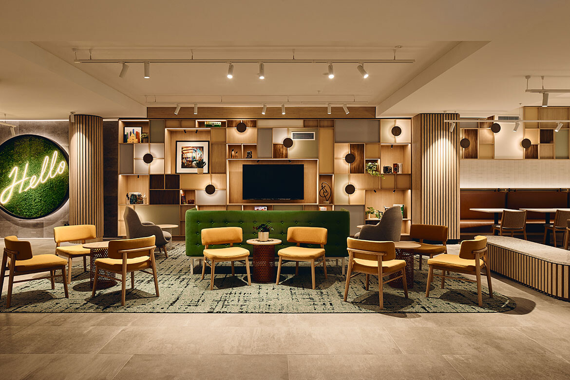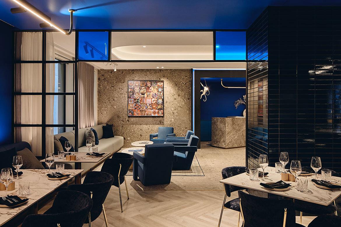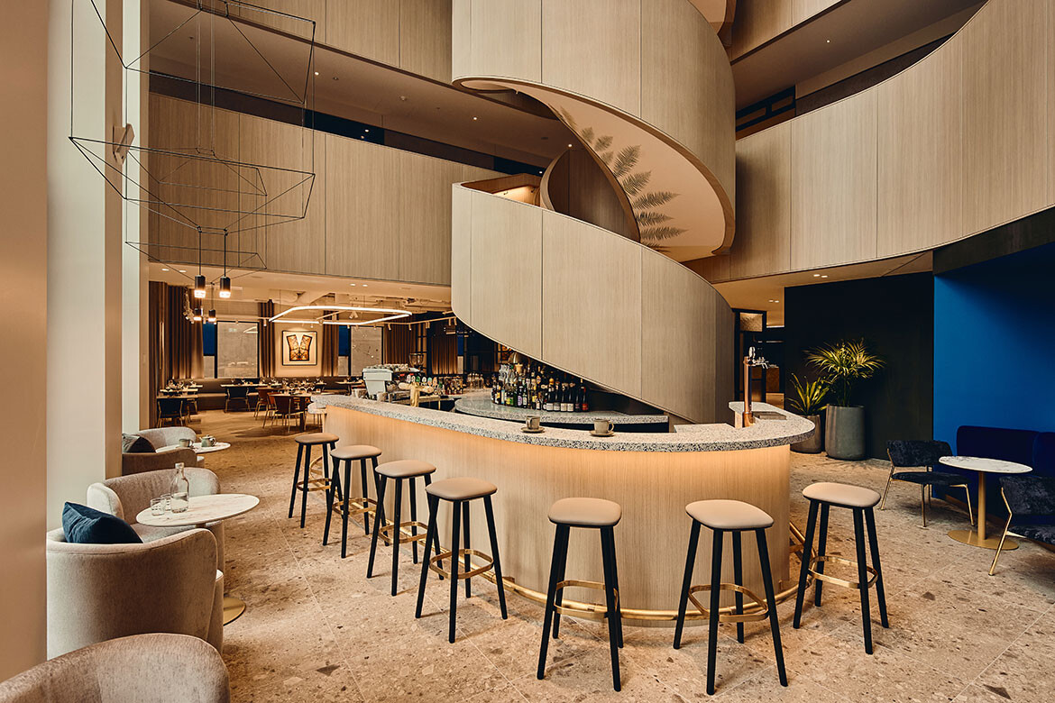 The dual hotels, entered from the arcade, each carry distinct identities. Holiday Inn uses warm, natural materials, textures and greenery for a calm, home-away-from-home feel welcoming families. Hotel Indigo creates a bespoke local experience, with interiors reflecting the site’s quirky historic retailers – Sidney Meyer’s haberdashery, E W Cole’s ’emporium of everything’ and James Hosie’s Turkish baths referenced through fabrics, rugs, glassware, terrazzo and monkey lamps. The material palette mixes Mondrian blue with ceppo tiles and brass highlights.