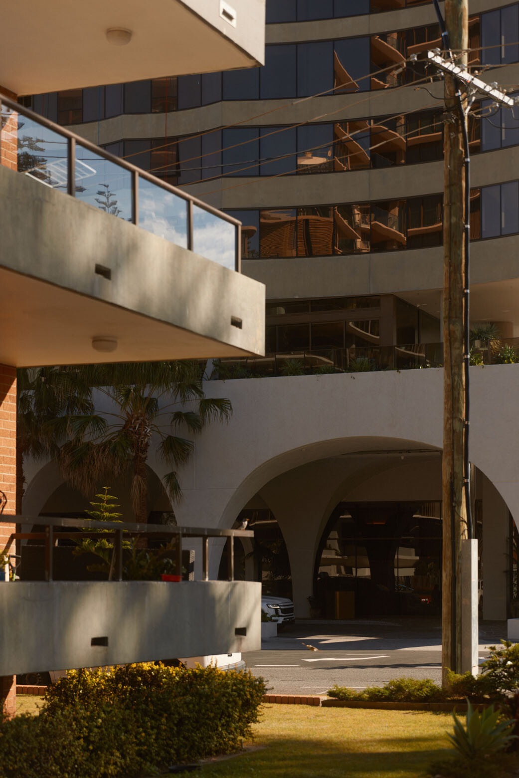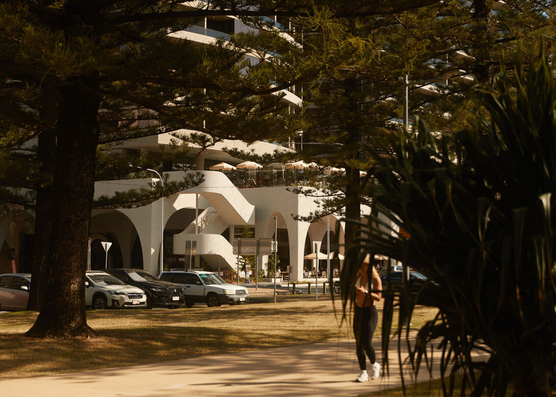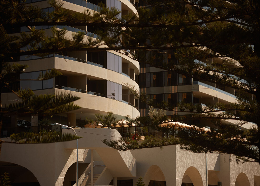 Set just steps from the sand, the development comprises two sculptural towers rising from a porous, low-scale podium. The building resists the idea of the sealed resort, instead positioning itself as part of Burleigh’s everyday life. Hospitality venues open toward the street, movement flows through the site, and the line between guest and local is deliberately blurred.