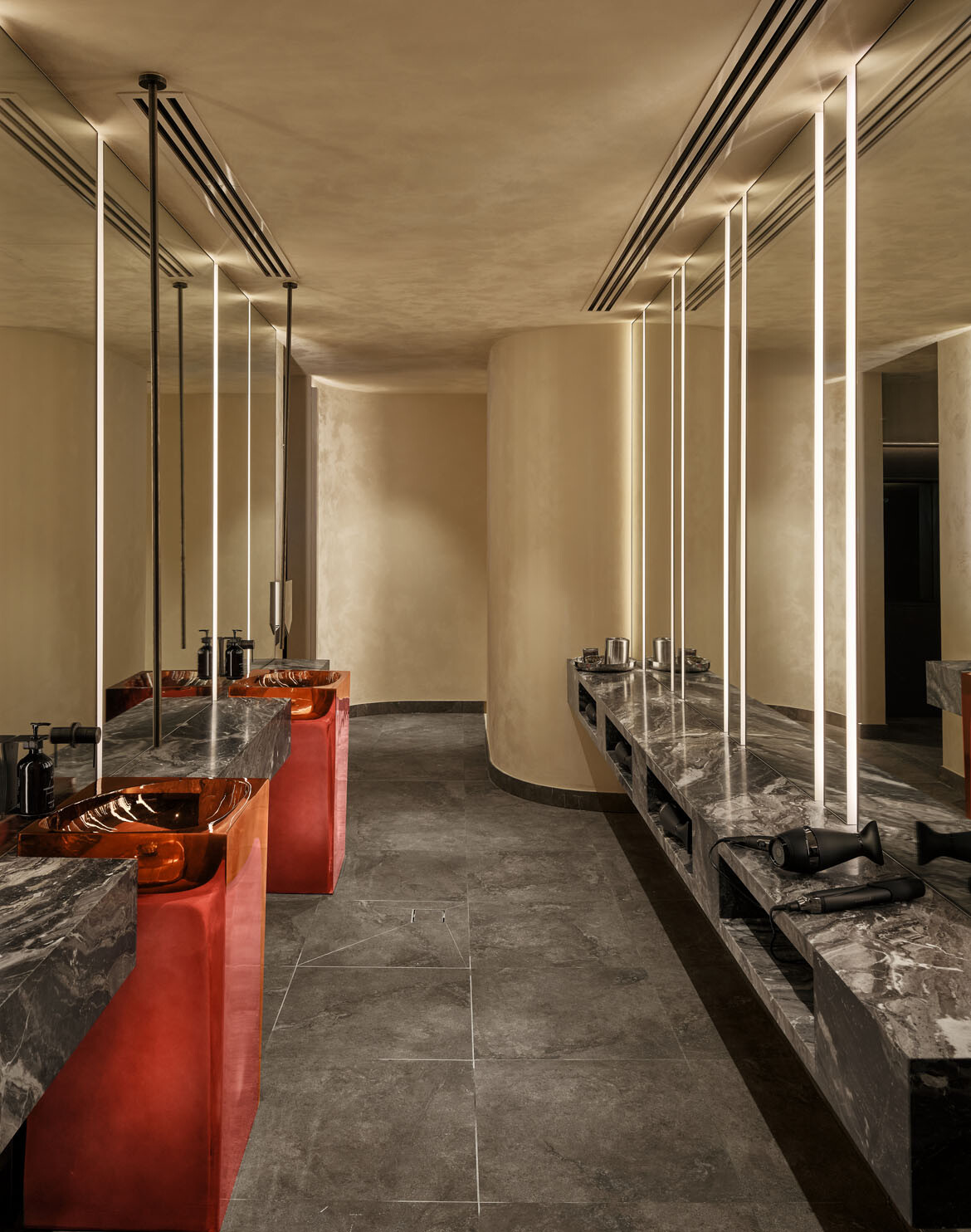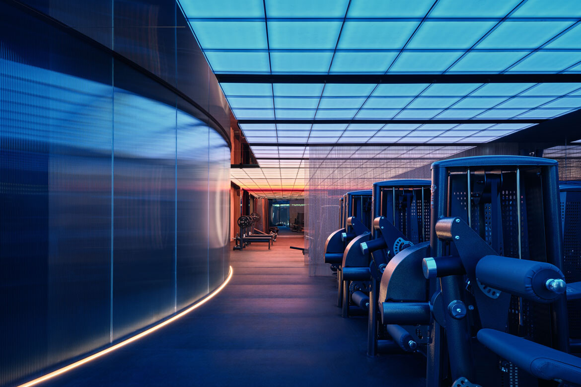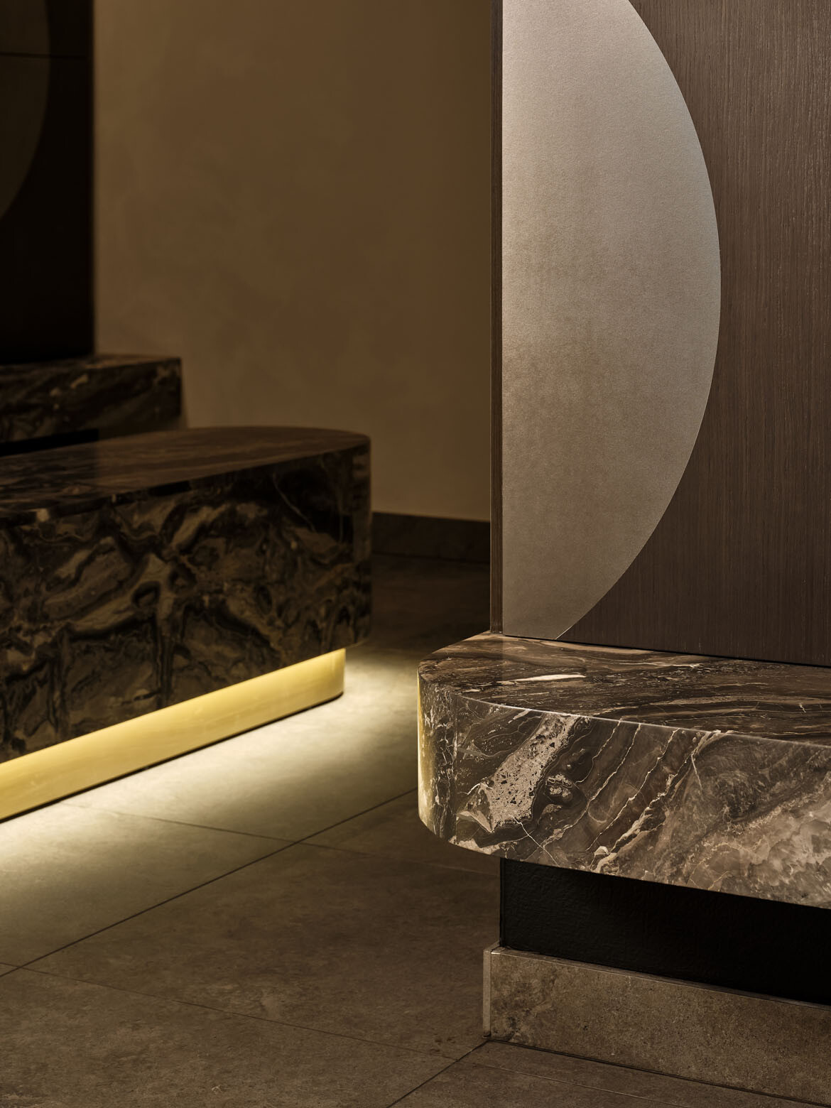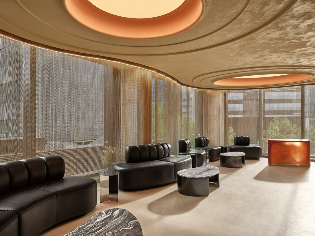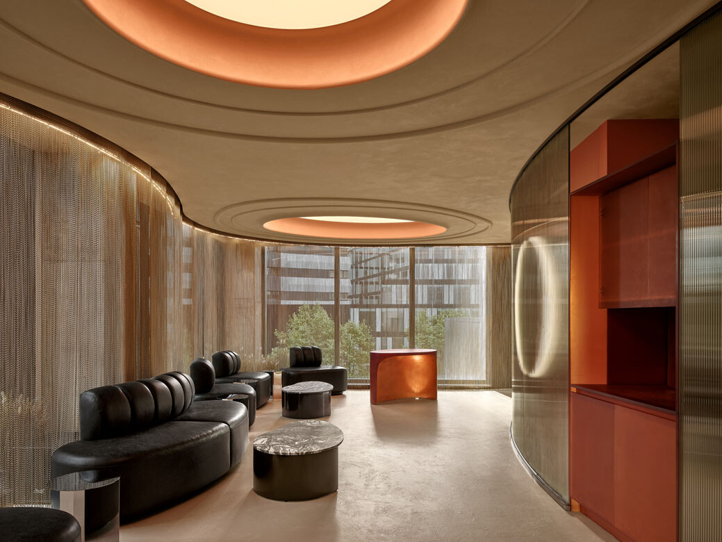 Lighting is largely recessed and diffused, guiding movement through corridors and shifting in tone depending on function and time of day. Reflective surfaces amplify this effect, balancing restraint with moments of drama.