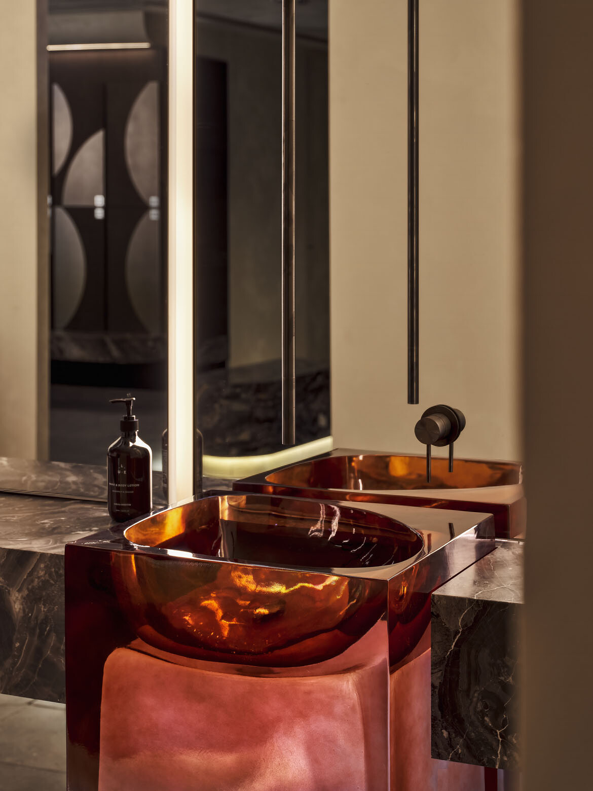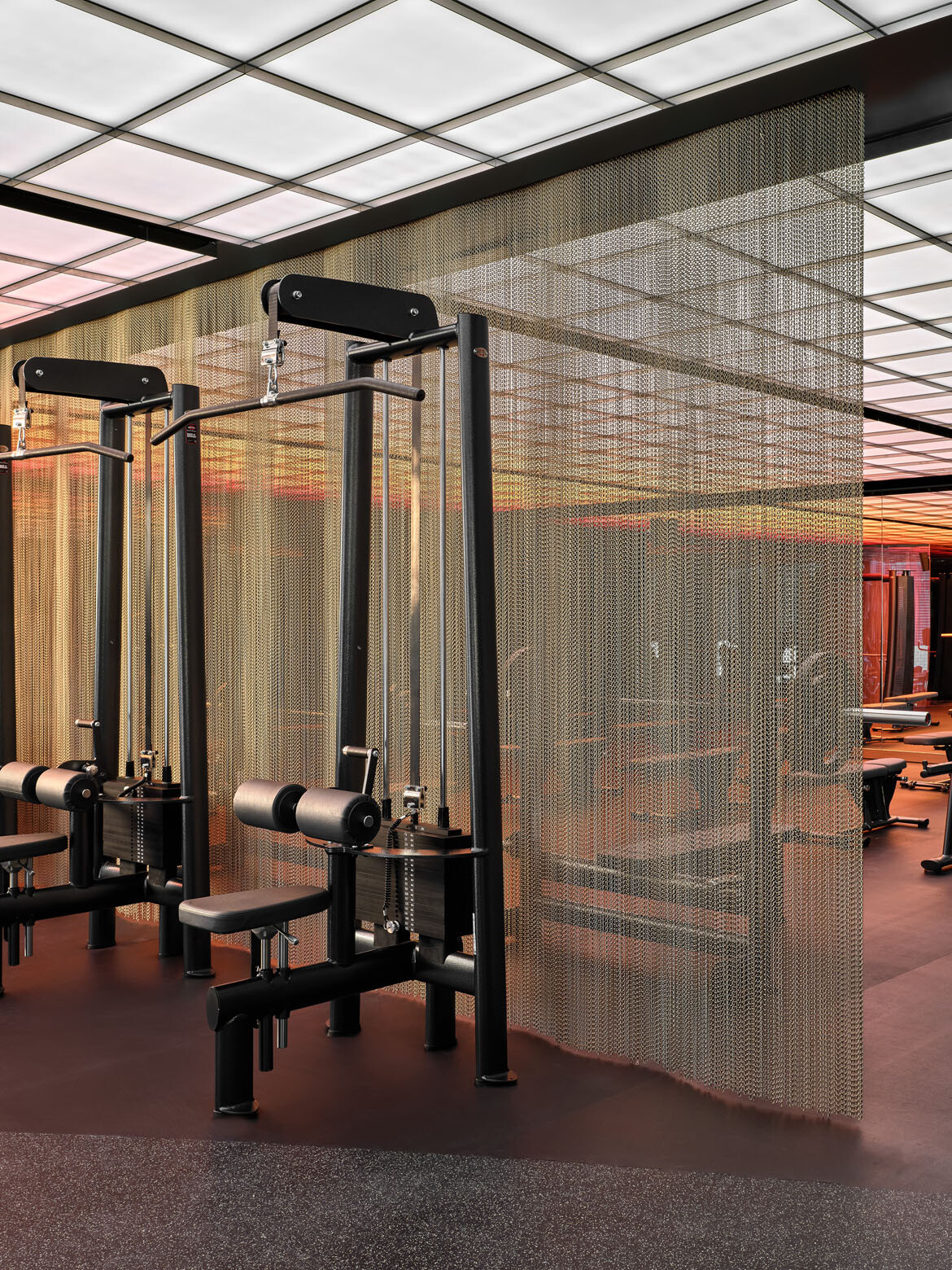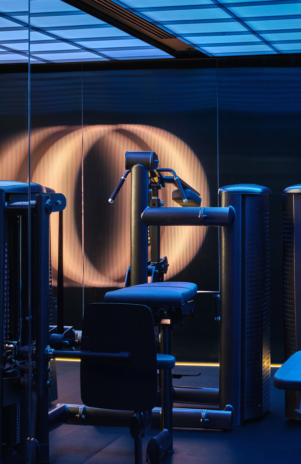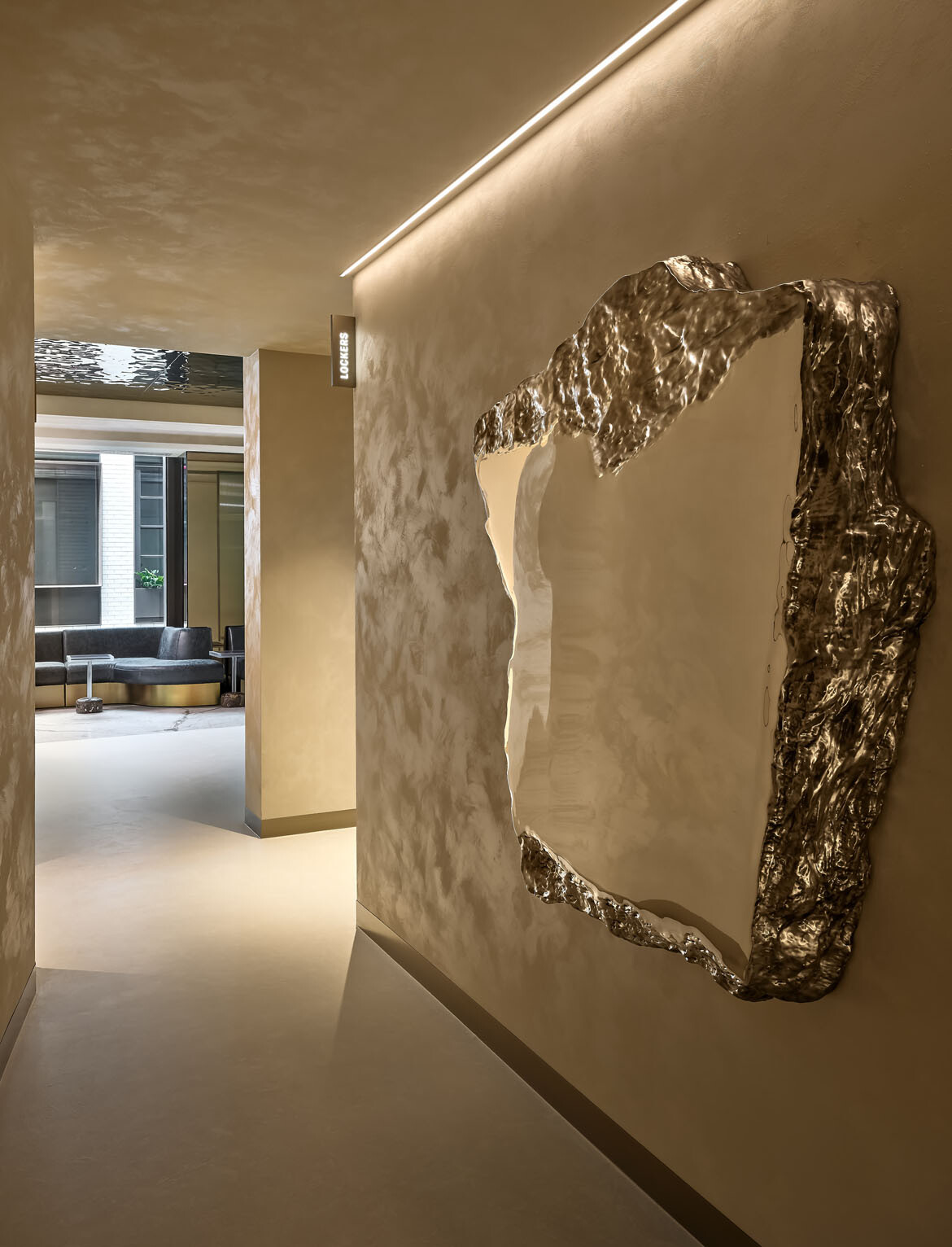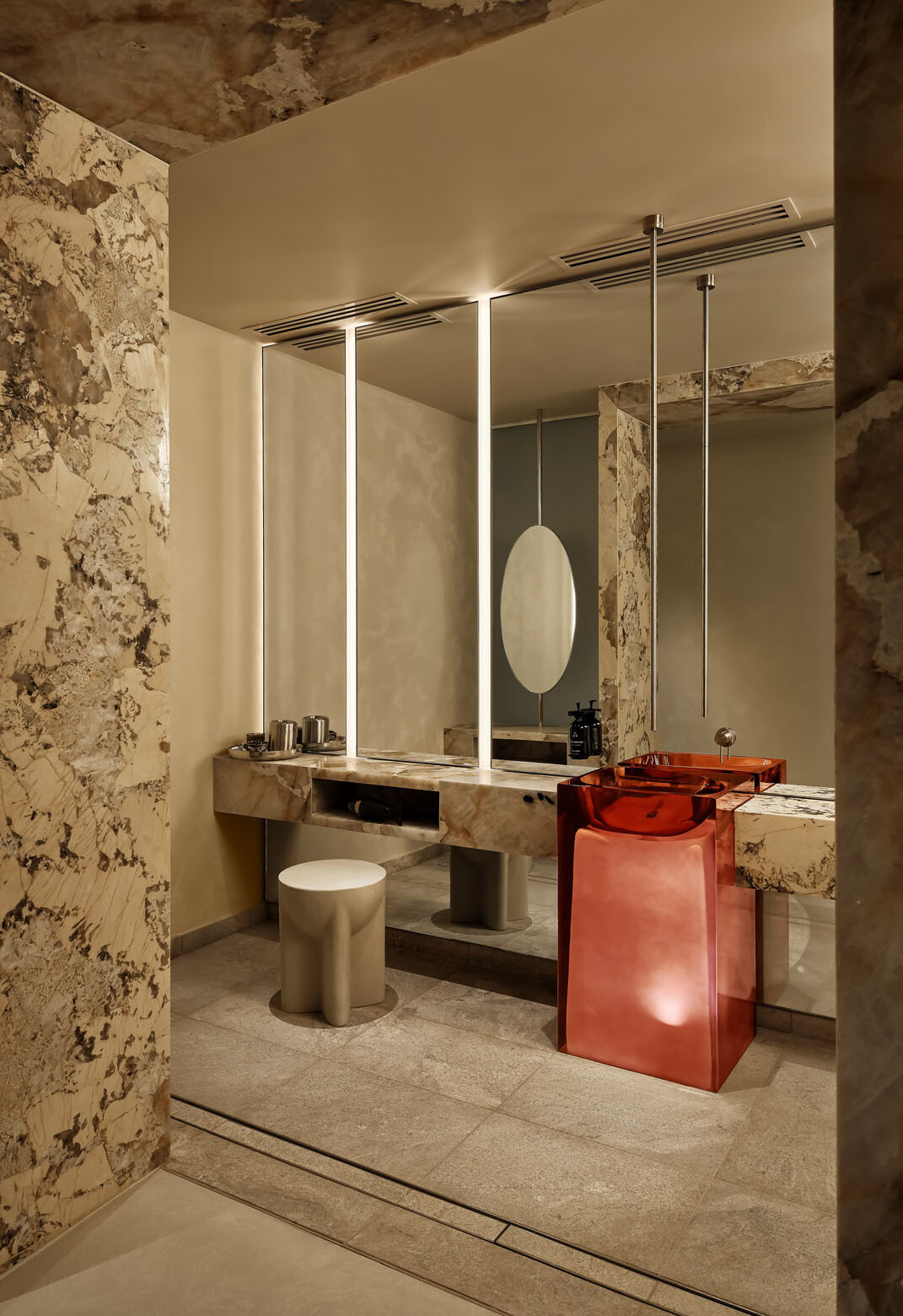 Lighting is largely recessed and diffused, guiding movement through corridors and shifting in tone depending on function and time of day. Reflective surfaces amplify this effect, balancing restraint with moments of drama.