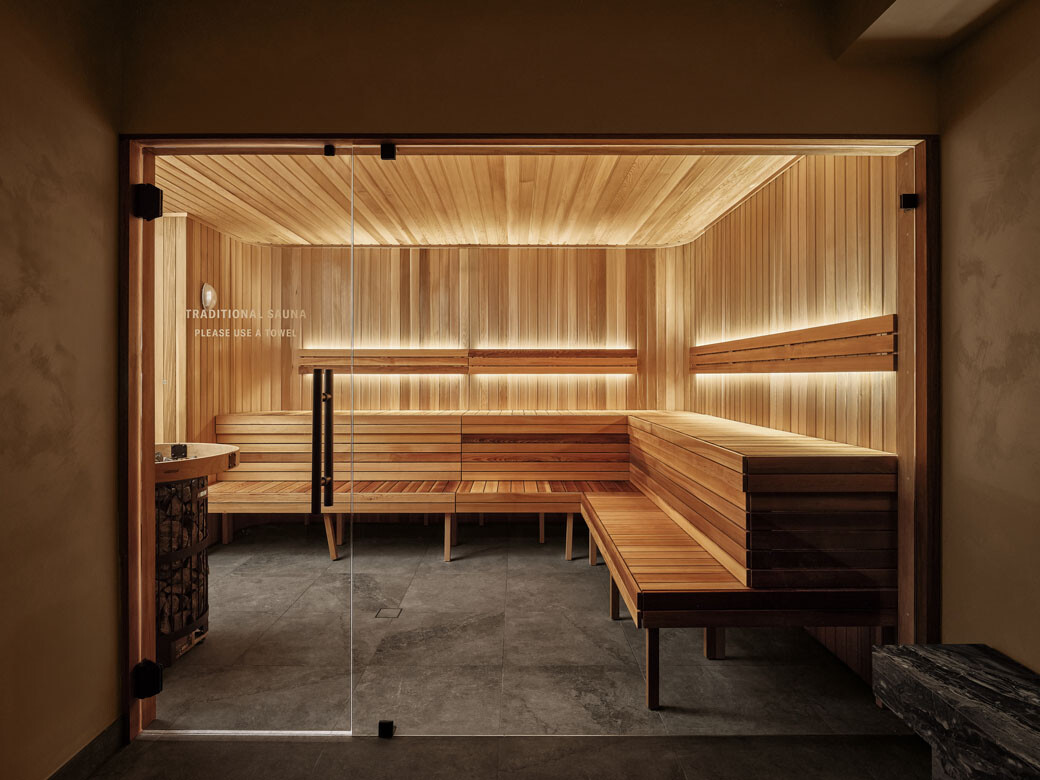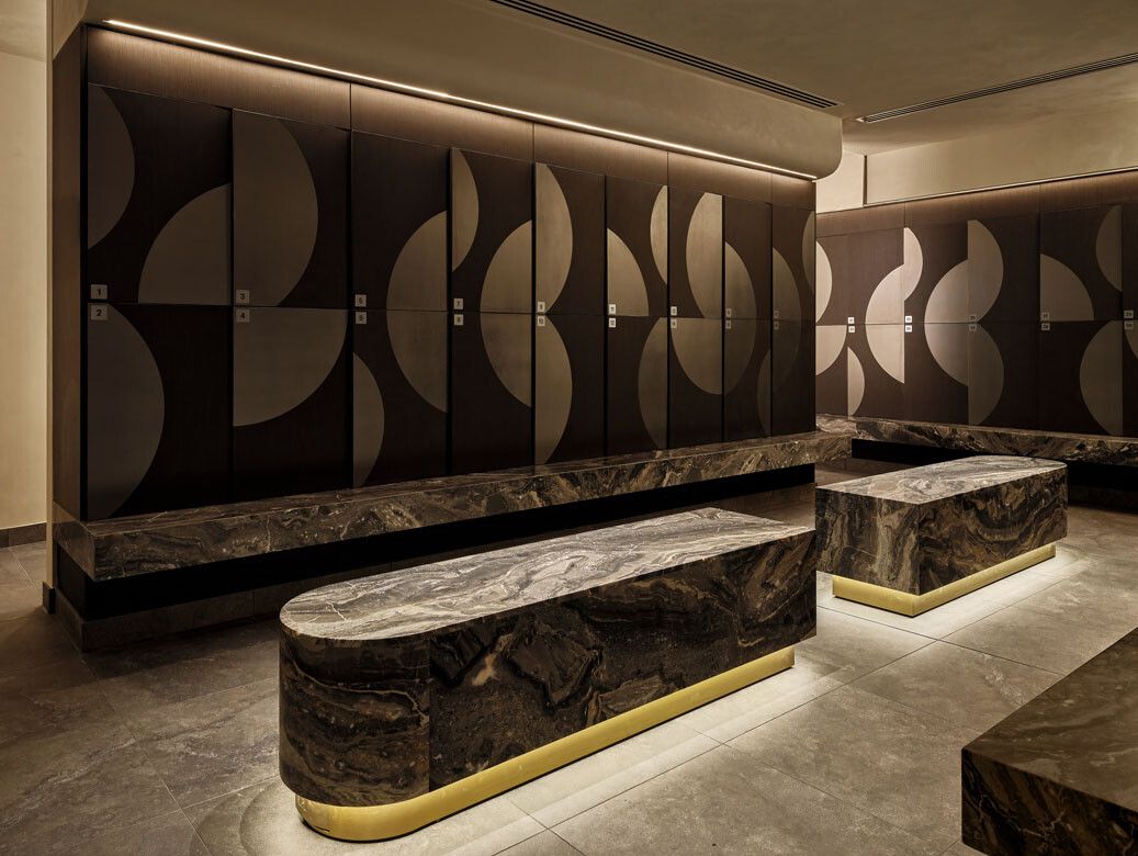 While One Playground offers an extensive range of facilities, it is the interior detailing that distinguishes the project. Materials more commonly associated with high-end residential or hospitality settings elevate the experience. Polished plaster walls, bespoke gilded organic-shaped mirrors, travertine floors and marble benchtops with custom burnt-orange washstands contribute to a refined yet robust palette.