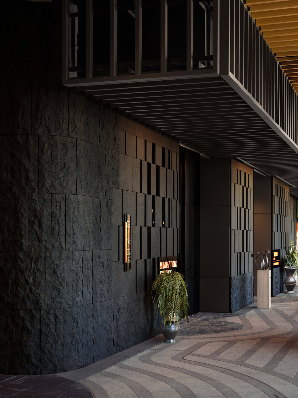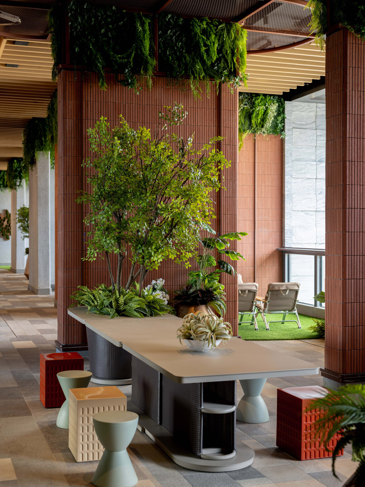The 30th floor is more open and communal, hosting multifunctional courts, a leisure garden, party zones and shared tables. At night, soft lighting filters through vegetation, creating layered shadows reminiscent of a park landscape.