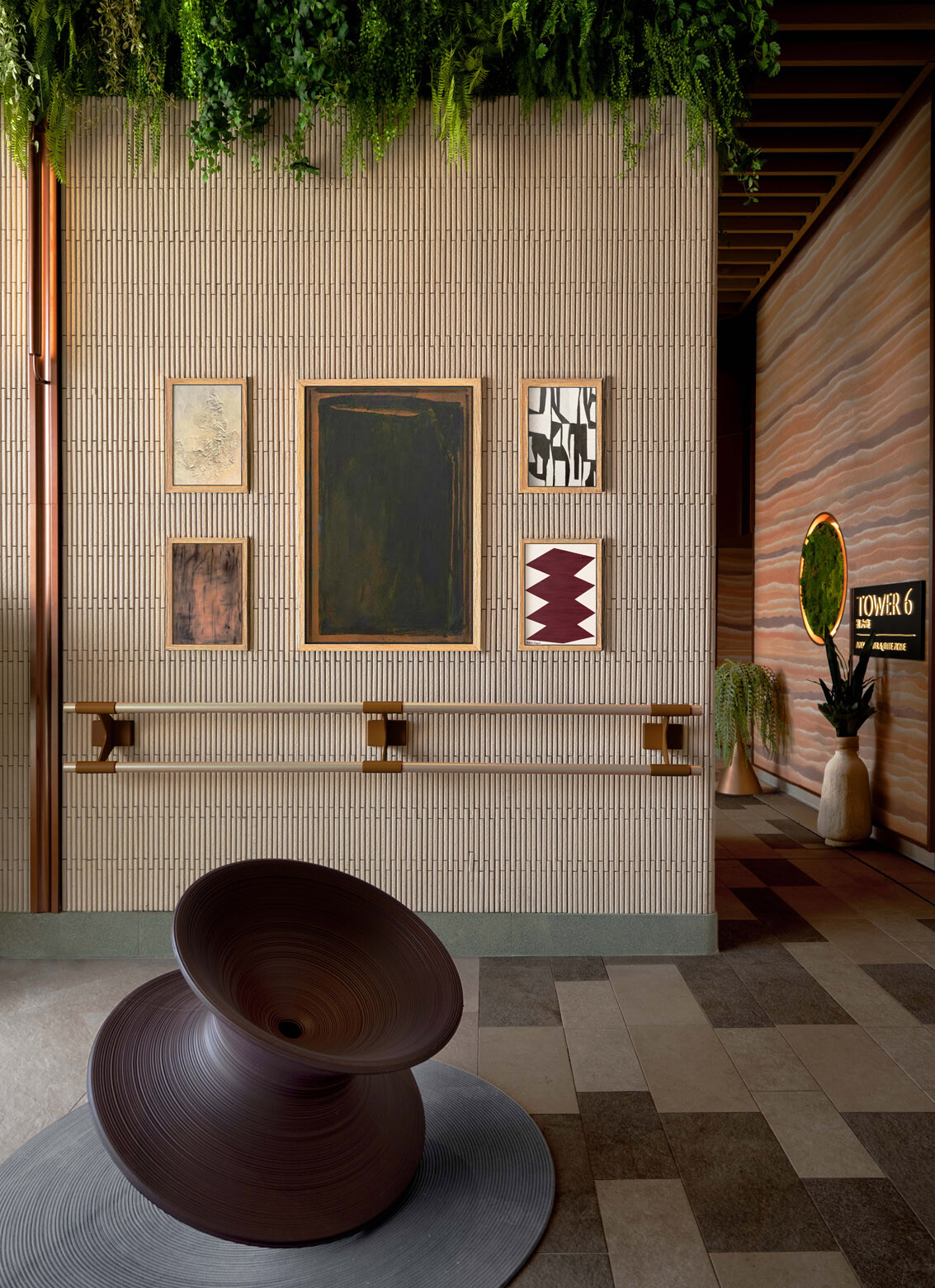 The 31st floor adopts a quieter rhythm. Existing shear walls from the apartment structure form intimate “rooms.” Wooden flooring and rammed earth walls introduce warmth, while green walls and suspended plantings cultivate calm. This level includes a tea room, reading area, yoga studio and children’s playground. The two levels are connected by a curved central staircase and a “Landing Lounge,” reinforcing the sense of moving between floating islands.