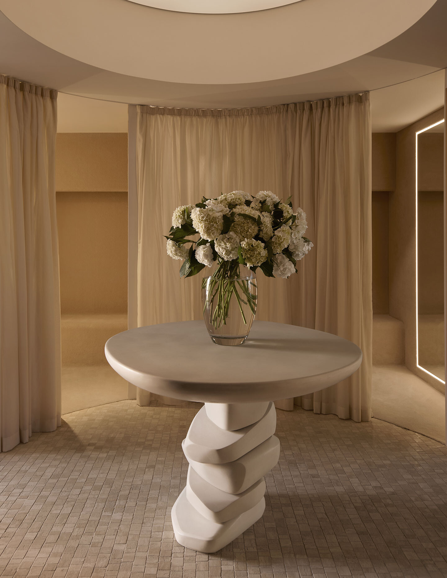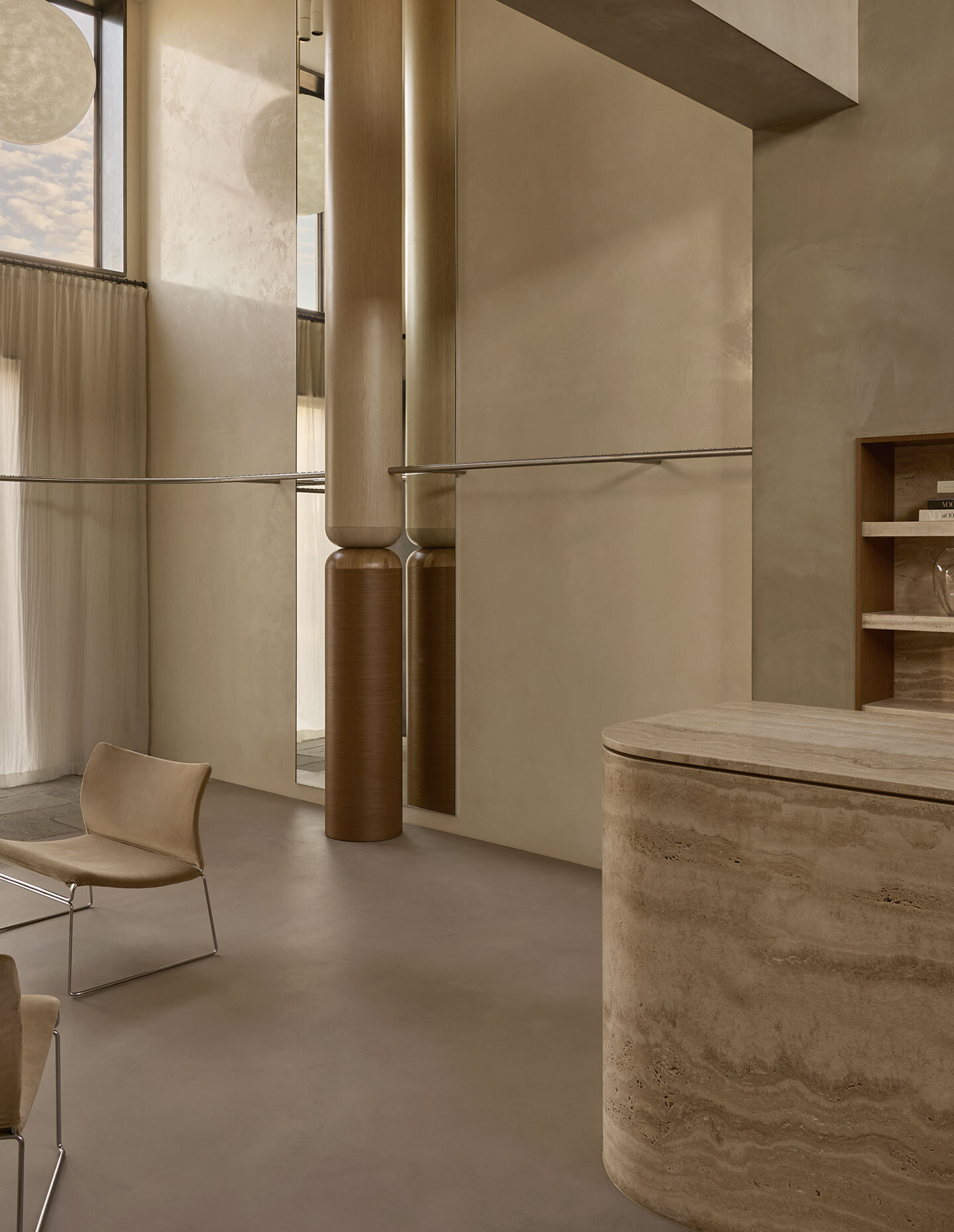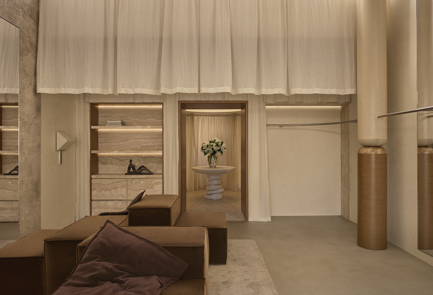 The new store is layered and spatially articulated, reflecting the tempo and tactility of modern retail. Perera’s approach combines soft, feminine gestures with robust, sculptural elements, creating a design that is at once inviting and intentional. “We didn’t want to just cram in product. It’s about generosity – giving people space to sit in a garment and see how something feels on the body, how it moves.”