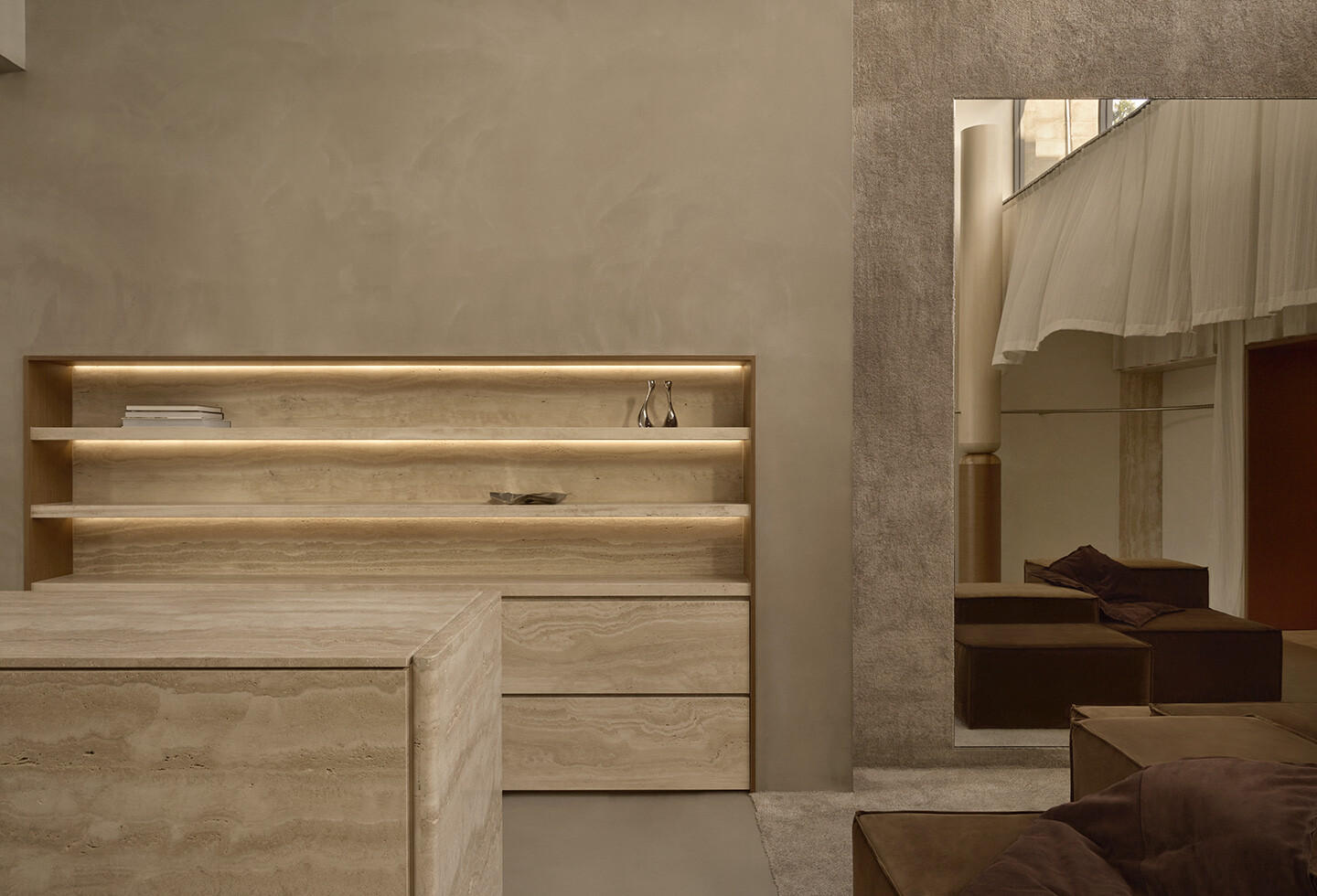 While the aesthetic is refined, practical demands are never sidelined. “Retail needs to function,” Perera notes, speaking to the ever-present end user. “There are set amounts of lineal metres of racking required, changing room flows, storage areas. But it can still feel elevated.” This striking duality is perhaps best captured in the balance between showpiece gestures – such as the finely detailed travertine counter or the crushed silk linings – and the workhorse elements discreetly integrated throughout the fit-out.