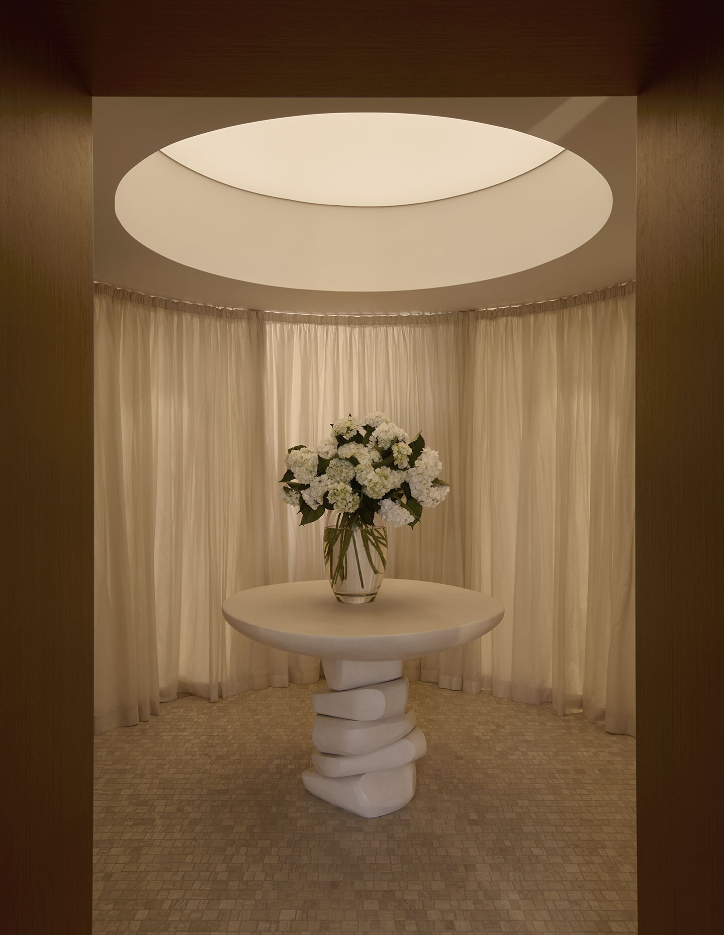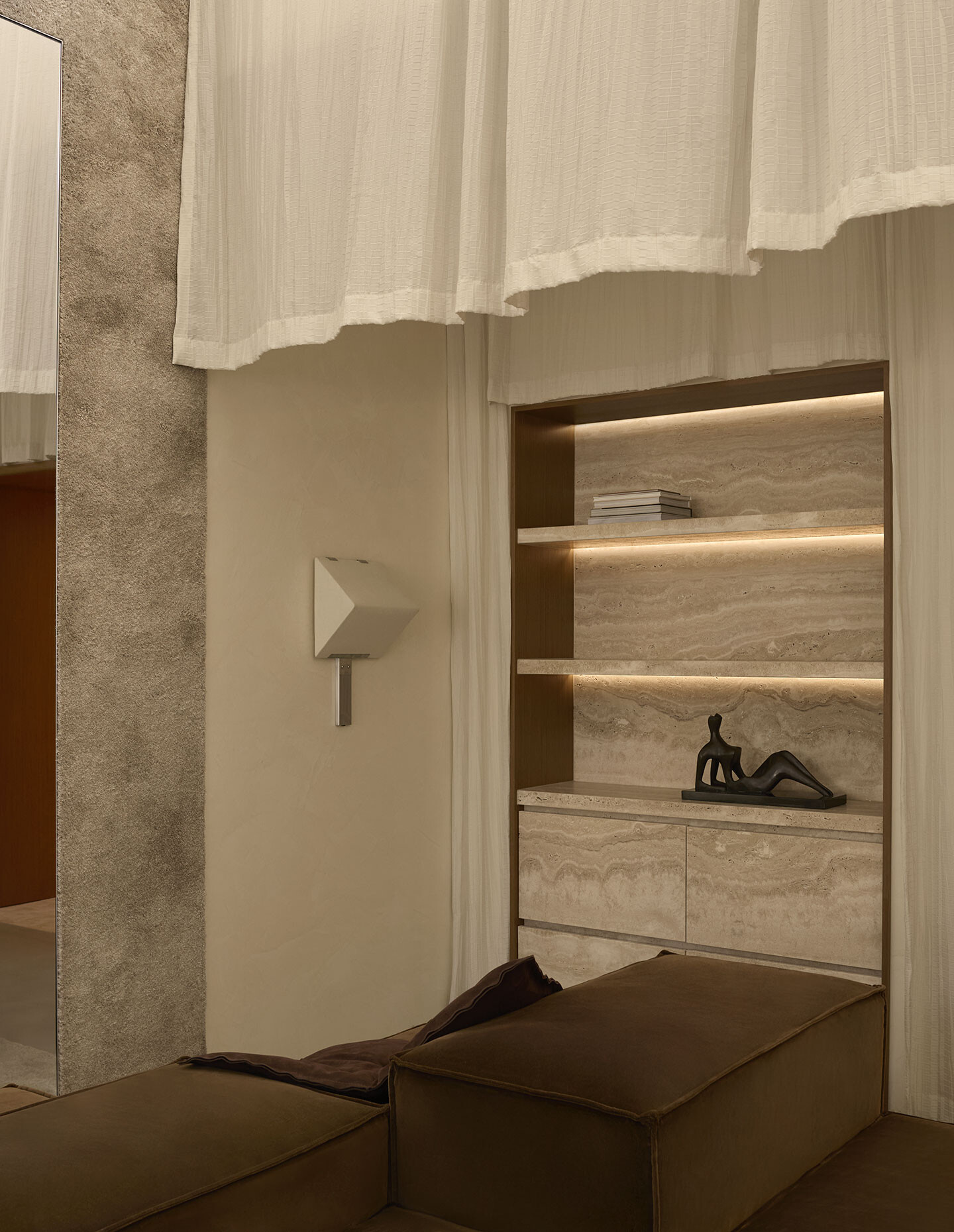 Materiality is restrained but rich. Neutral but textured carpets climb the walls in enveloping gestures, while microcement and mirrors interplay with crushed silk and natural stone. A standout feature is the custom pendant by artist Amy Vidler – a glowing form inspired by a child’s sketch of a dollhouse, which sits suspended like a beacon in the centre of the space.