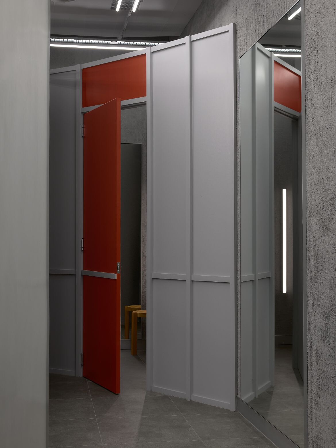 Despite the tight footprint, the plan accommodates two generous change rooms and a discreet back-of-house zone at the rear. Angular forms contrast with the softer curves of the central module, while brightly coloured doors, informed by modernist colour theory, punctuate the otherwise restrained palette and add moments of visual tension.