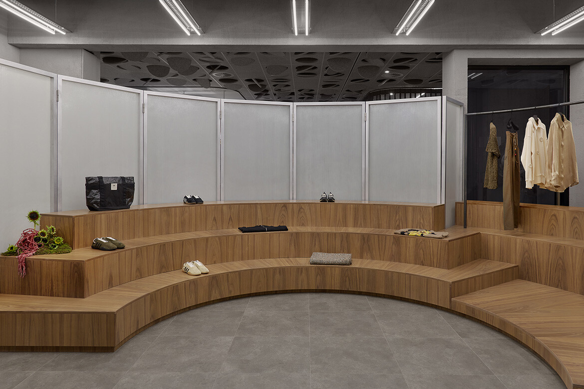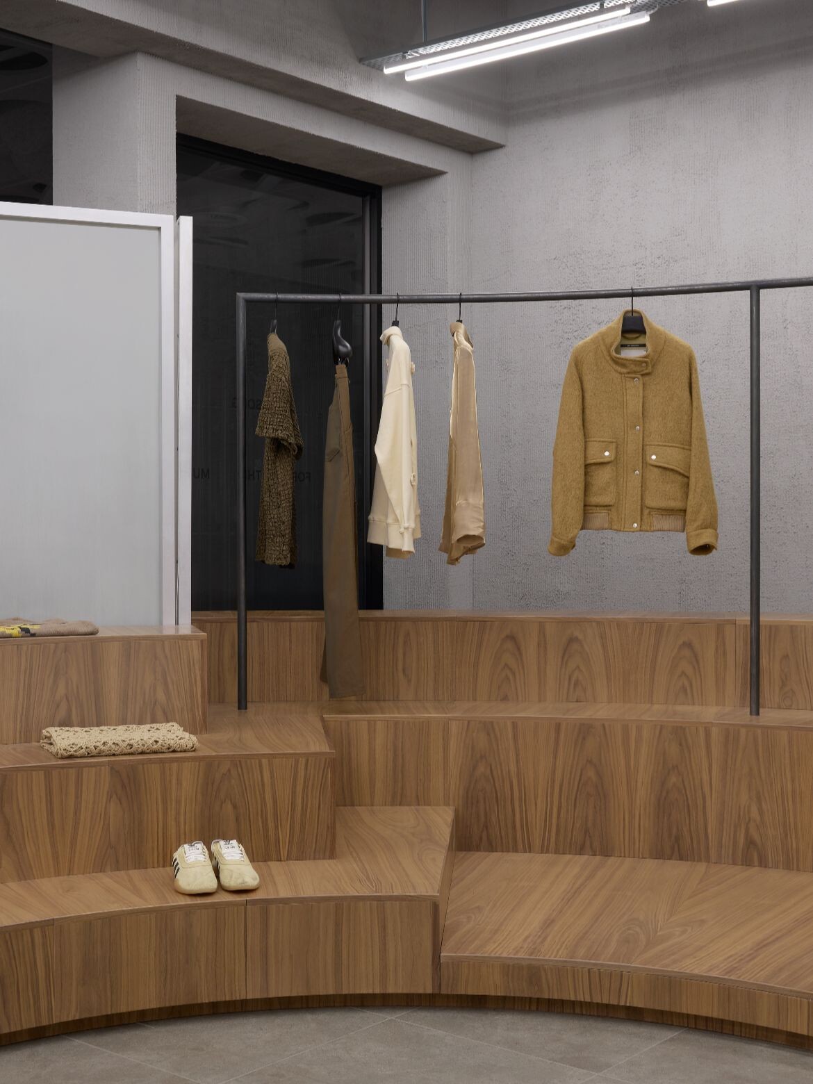 The store reads more like a gallery or performance space than a traditional boutique. Each element is carefully edited, allowing the garments to breathe while reinforcing the experiential quality of the interior. A tiered, custom timber structure anchors the centre of the space, extending toward the shopfront window and providing a flexible platform for merchandising. Partially veiled by semi-transparent partitions, the structure evokes the motion of a spinning record, abstracted into a sculptural, three-dimensional form.