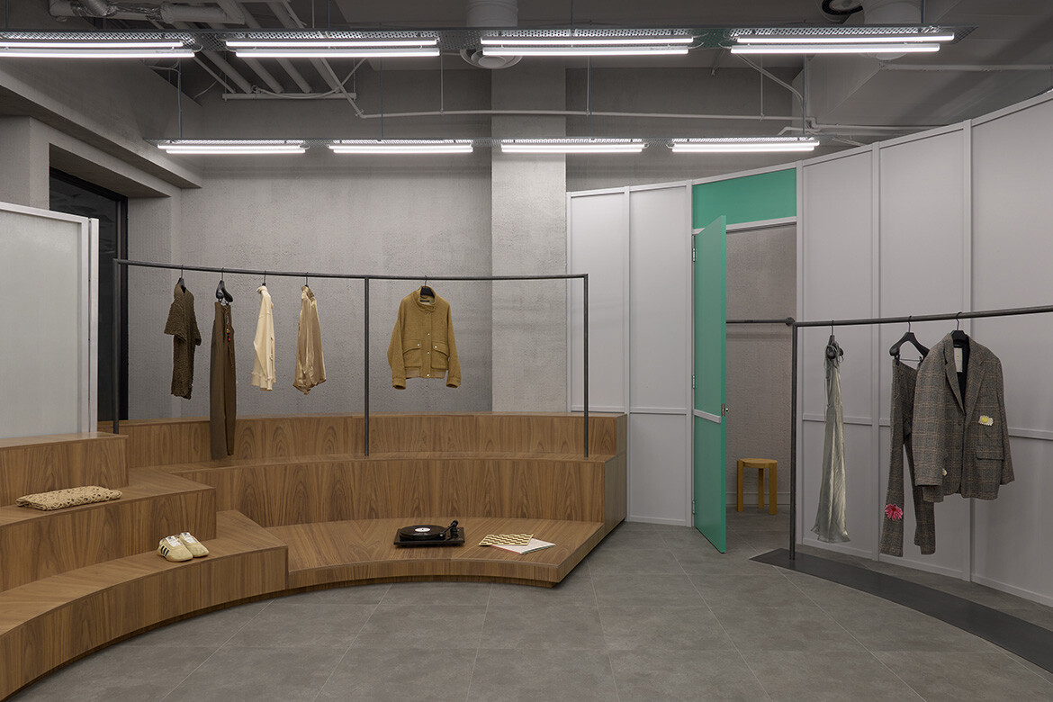 Inside, the spatial concept takes its cue from music. The layout is organised around a central, curved module inspired by the mechanics and symbolism of a record player. Clothing is displayed along the inner face of this circular form, encouraging visitors to move around it slowly, almost ritually, as though following the groove of a vinyl record. The result is a rhythmic circulation that unfolds the collection in stages, rewarding curiosity and close engagement.