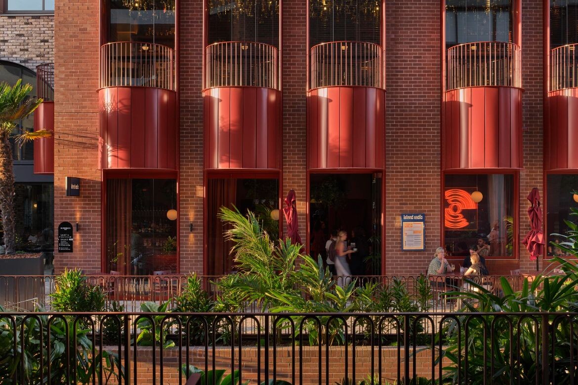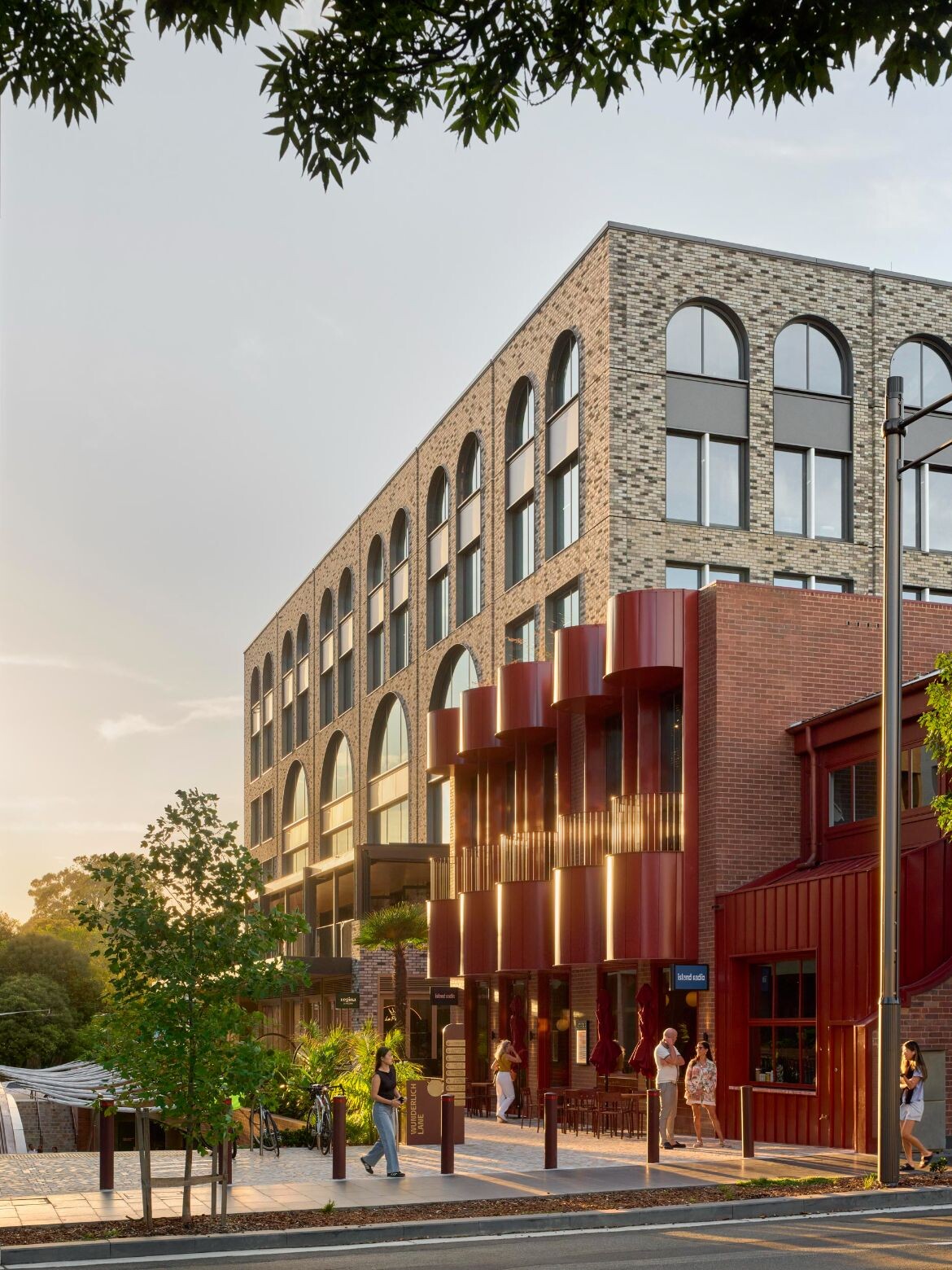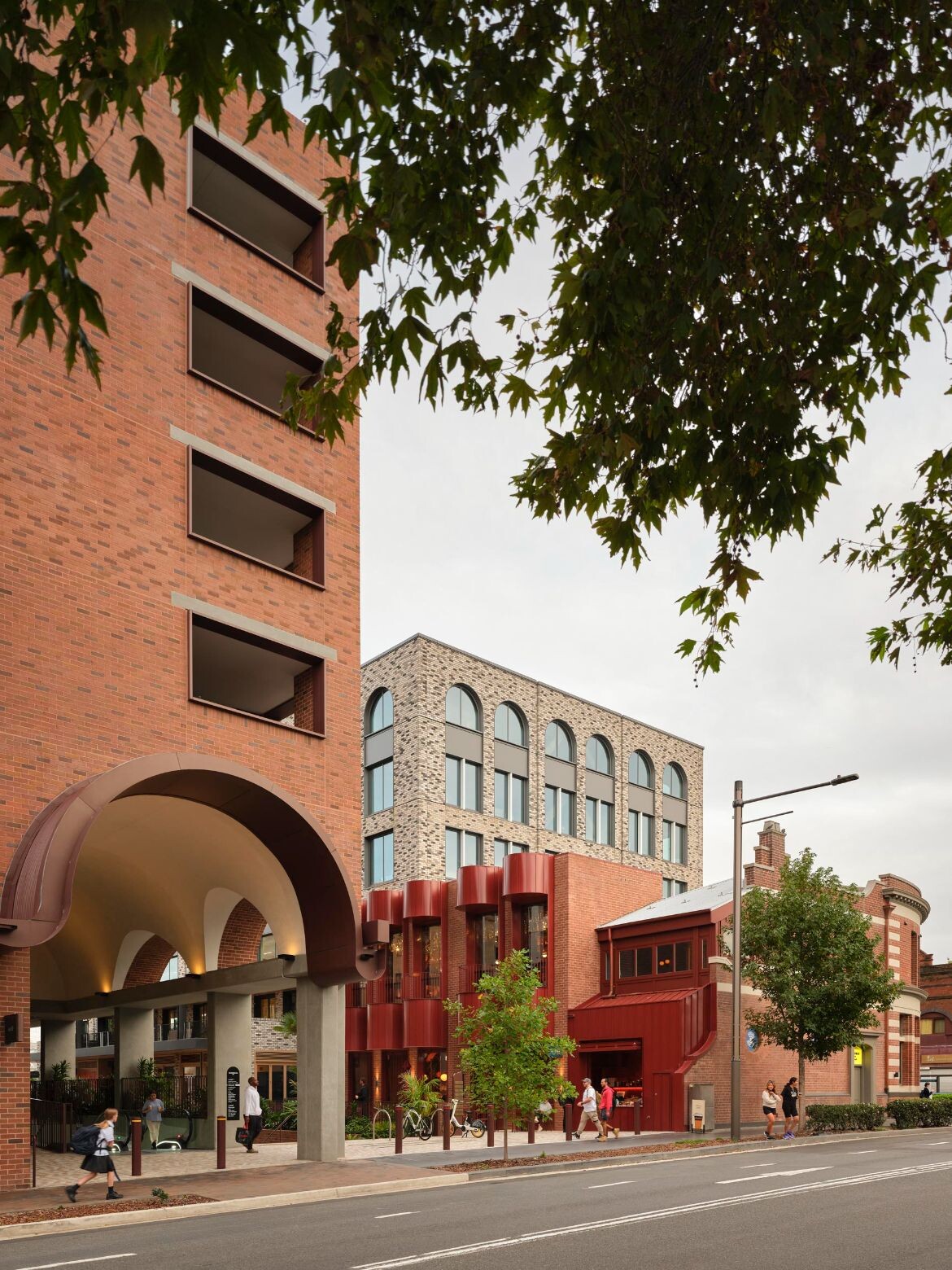 Unifying the whole are red bricks that share a common language with the mounted police stables opposite. “They’re tied together by the use of brickwork that extends up from the base and is very much speaking to the fabric of Surry Hills,” says Wombwell who notes that the hotel and the commercial buildings are each given their own colour variant and identity.