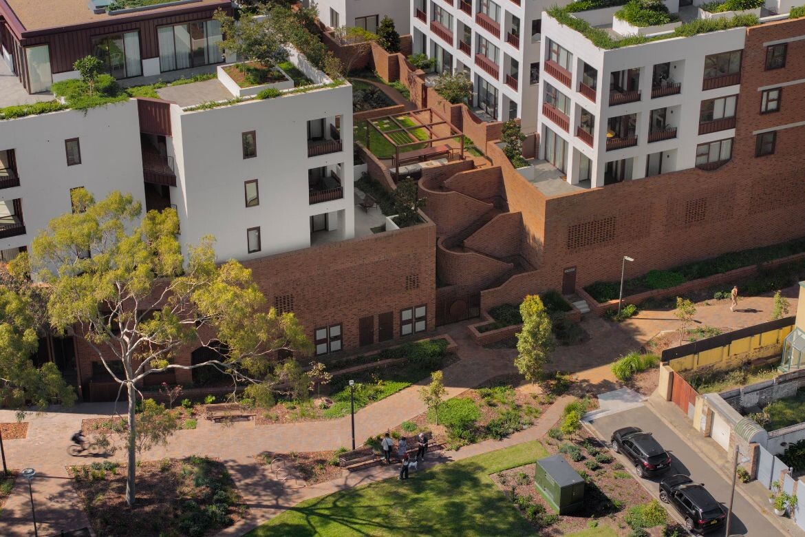 Comprising 116 apartments across four buildings plus six terrace houses, the residential offering is moderate and tuned to the location. Differing from the original design, three proposed residential buildings have shifted – two to hospitality, in the creation of The EVE Hotel with 102 rooms plus the enormously popular Bar Julius. The third has become commercial, with the large building on the corner of Cleveland and Marriott Streets comprising a mass timber construction.