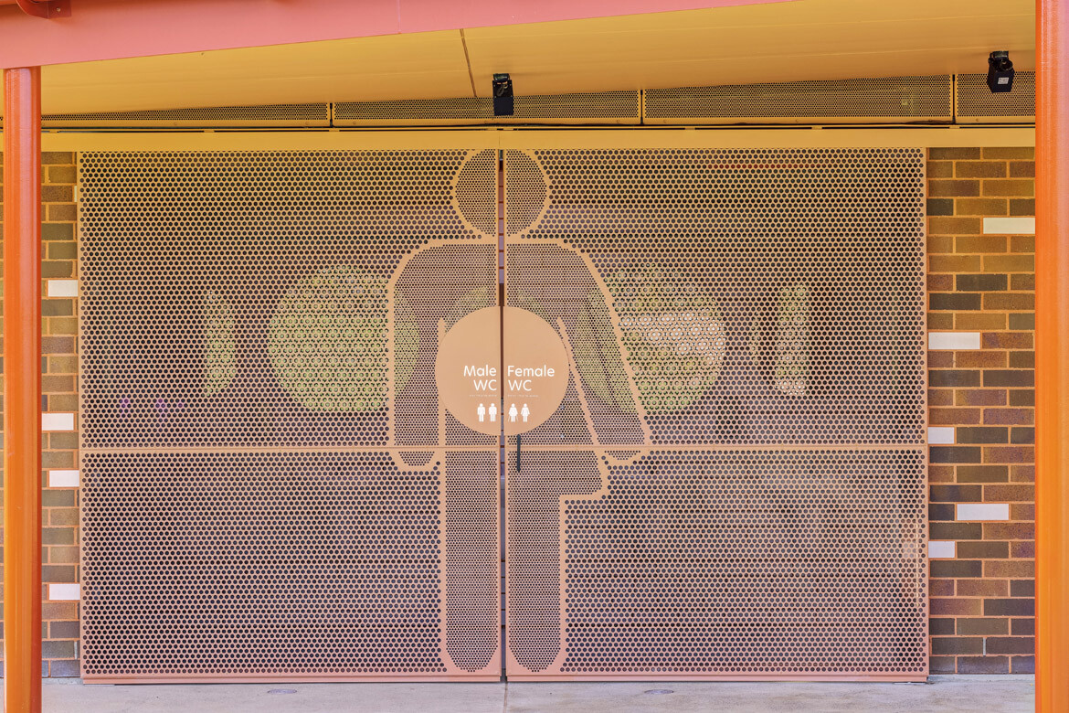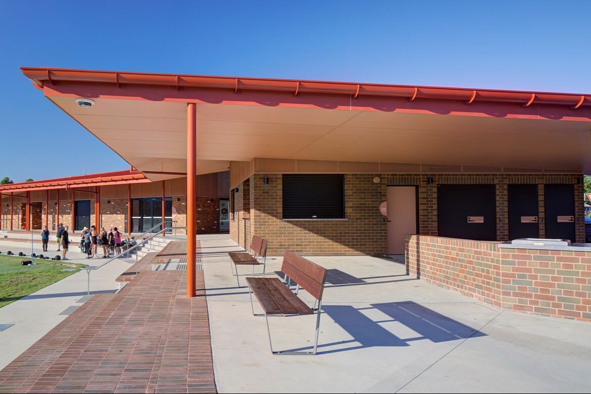 Functionally, the project houses a clubroom, kiosk, change rooms and public amenities, with stepped spectator seating and BBQ facilities. “The building needed to address two sports fields and the children’s playground, whilst also being within easy proximity to the site entry. As a result, we aligned the building along the west side of the main field and then ed it towards the northern field, allowing a spectator to have views across all critical areas whilst being sheltered beneath.”