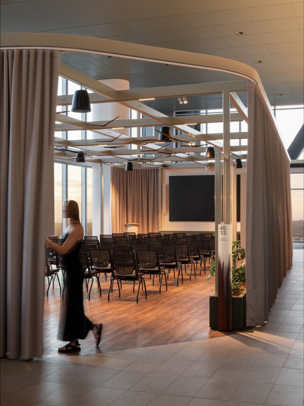 The crown jewel of this vertical landscape is Level 45’s Sky Terrace—a triple-height space with panoramic views that transforms the building’s summit into an employee-centric indoor community hub. Here, expansive views connect occupants to the Derbal Yerrigan (Swan River) while offering diverse spaces for social connection, focused work and contemplation. It’s workplace design that recognises the psychological importance of horizon lines and natural light in a city where both are abundant.