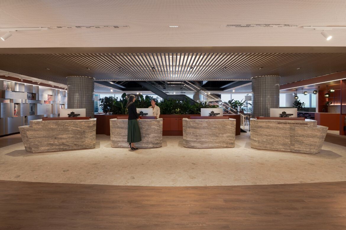 The arrival experience on Level 34 is framed by carved stone reception desks. The welcome area provides concierge services, formal meeting spaces and a business lounge that communicates the client’s connection to local and global communities.