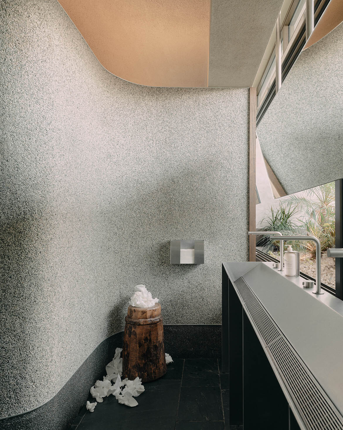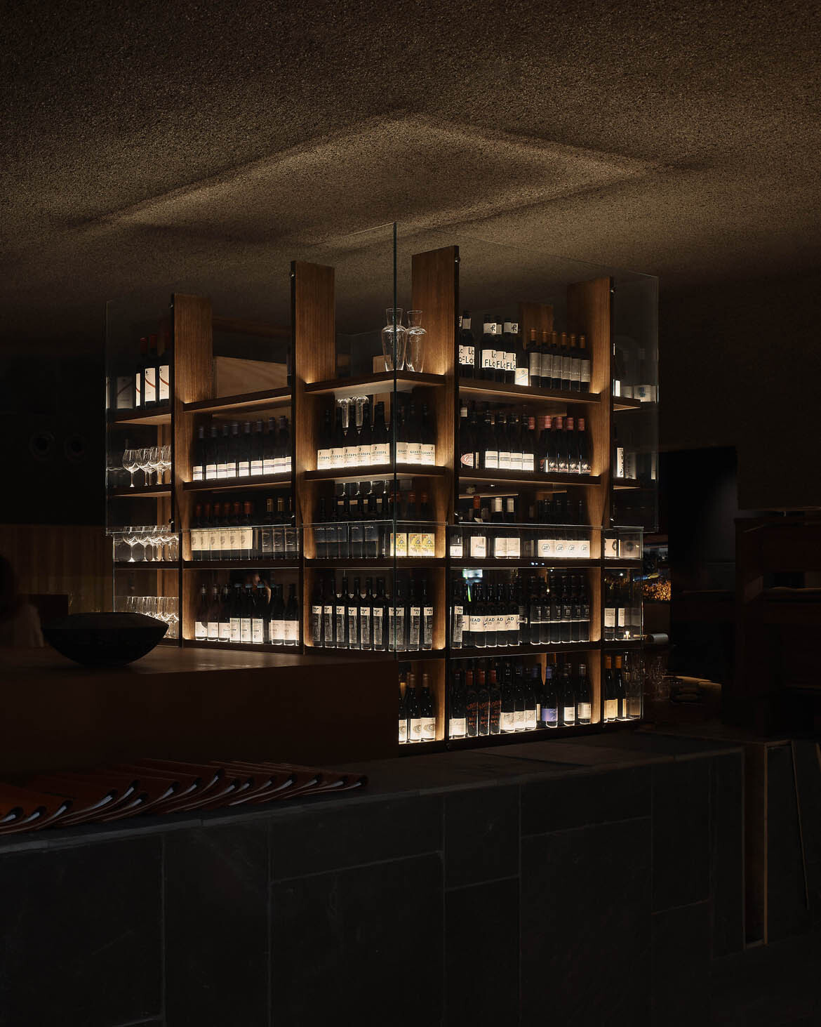 Every piece of furniture was designed in-house by J.AR OFFICE, rendered in generous proportions that evoke the unfussy geometry and material honesty of modernist design. The fabrics are deliberately chunky in their weave, expressing handmade character—local emerging textile designer George Park was enlisted to produce bespoke wall hangings. A waffle pod ceiling amalgamates the lobby, providing a hotel-like arrival sequence where guests are greeted and guided to their tables. Monolithic black granite benches and yellow travertine finished with stainless steel flourishes round out a material palette that is as considered as it is surprising.